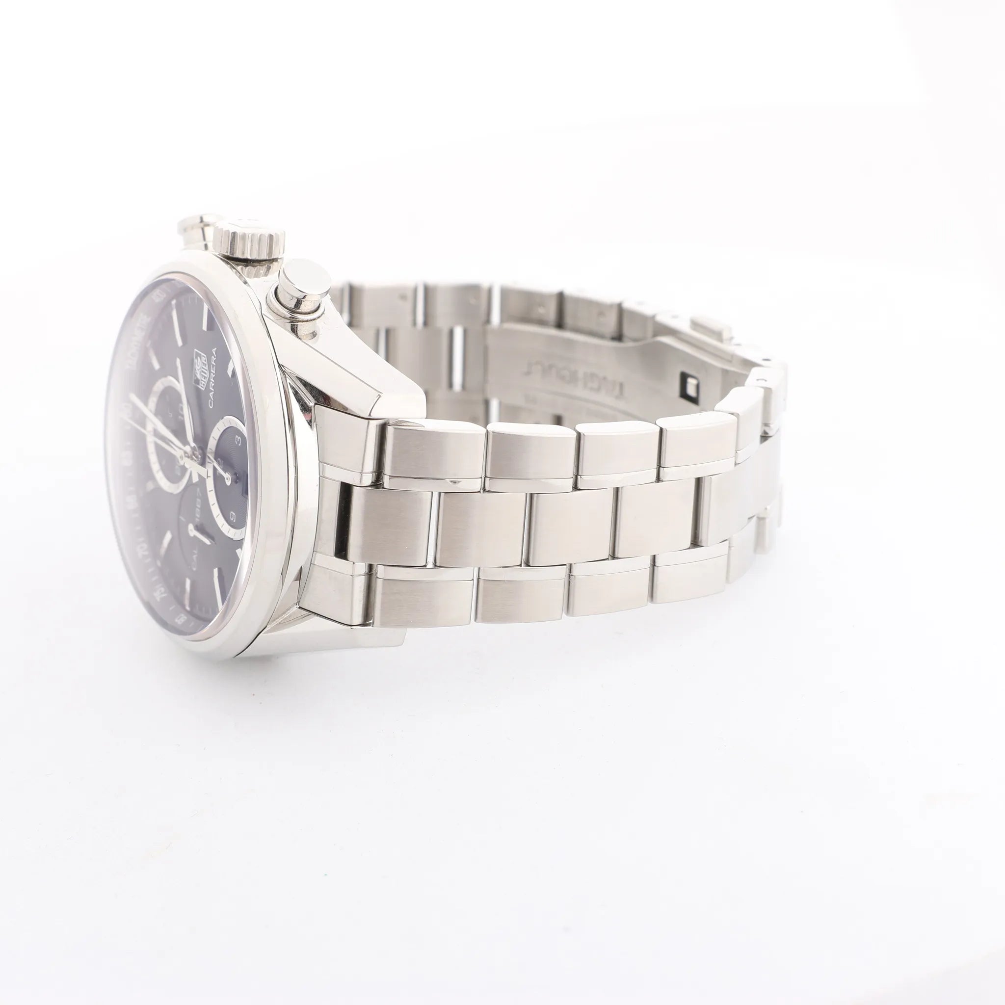 Brand: TAG Heuer Model: CarreraReference: CAR2110-4Serial No.: RUA1917Condition: ExcellentCondition Details: Light signs of use, including subtle surface marks barely visible to the eye. Please see photos for the exact condition.Dial Colour: BlackDial Material: Stainless steel Starp Colour: SilverStrap material: Steel Movement: AutomaticClosure: Fold claspDial Diameter: 40 mmApprox. circumference: 20 cmComes With: Papers, Certificate, Service card