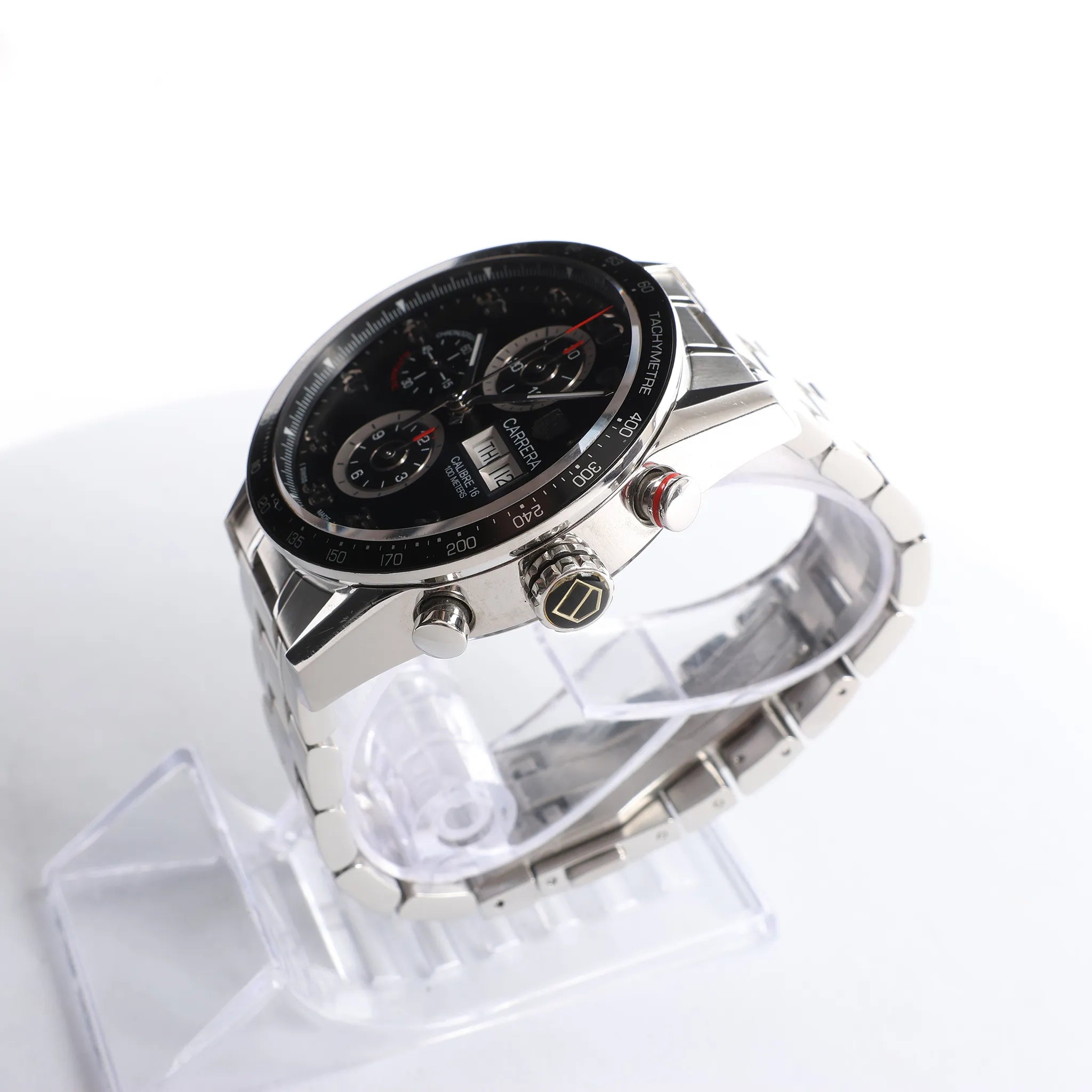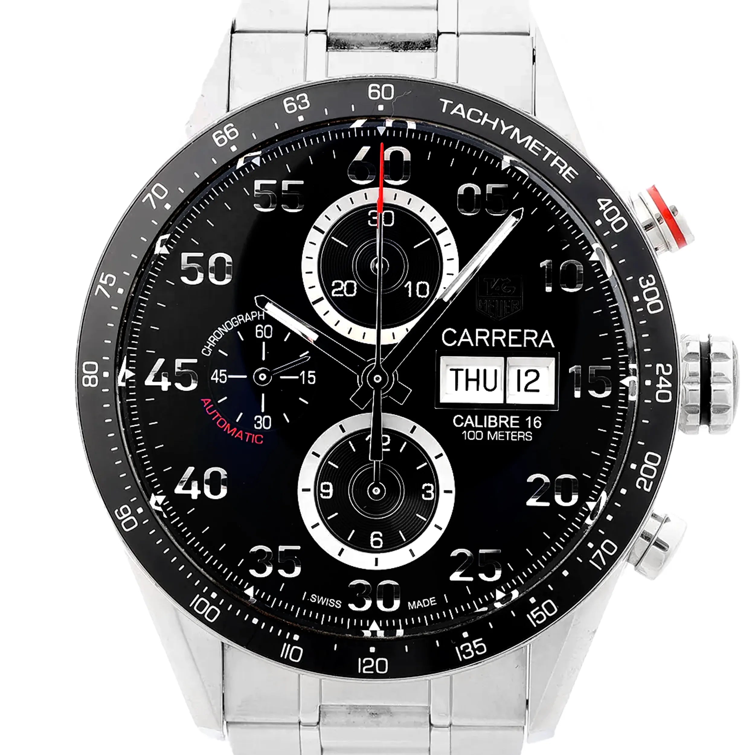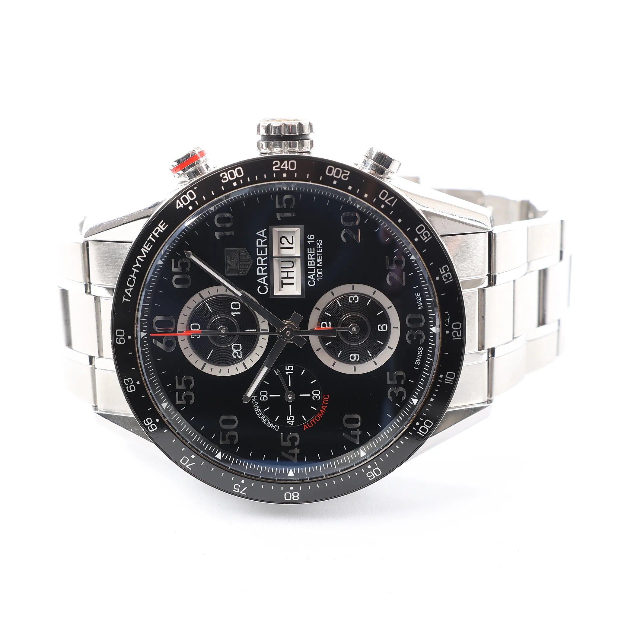 TAG Heuer Carrera Calibre 16 CV2A10.BA0796 stainless steel automatic chronograph—bold black dial with tachymeter bezel and day-date display for race-inspired everyday performance.