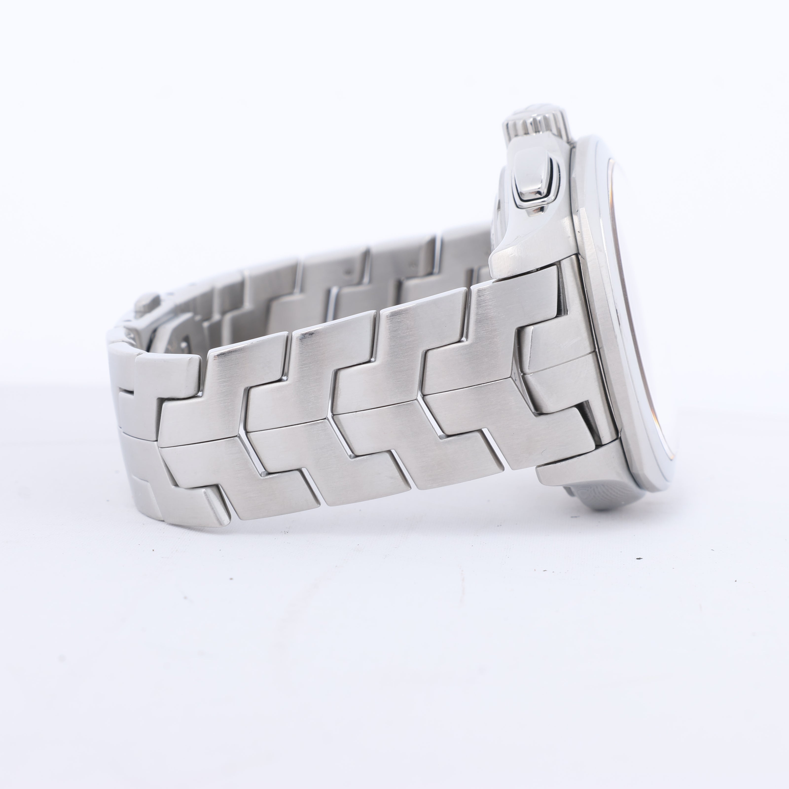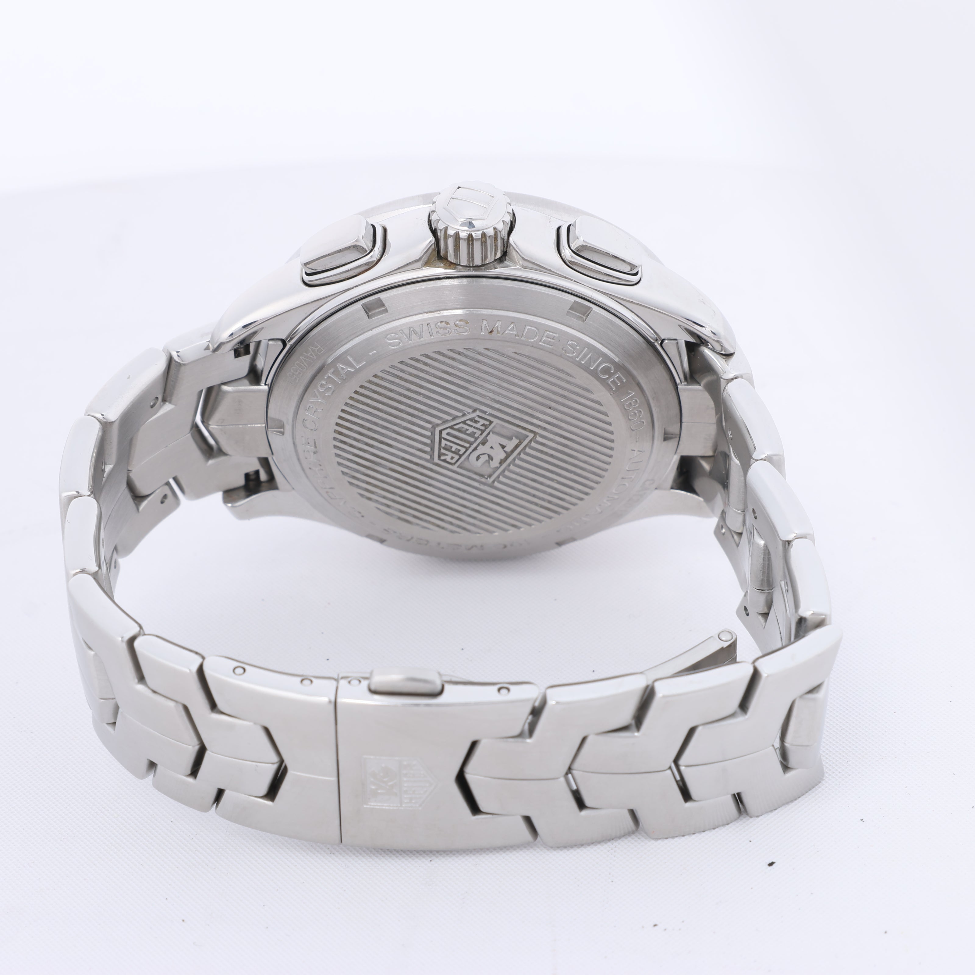 Brand: TAG Heuer Model: LinkReference: CAT2012 Condition: ExcellentCondition Details: In great condition, has just been checked and serviced. The inside of the box is damaged.Dial Colour: BlackDial Material: SteelStarp Colour: SilverStrap material: SteelMovement: AutomaticClosure: Fold claspFace Diameter: 42 mm Approx. max circumference: 16.5 cm + 3 extra linksComes With: Box, Papers, Extra links, Service card