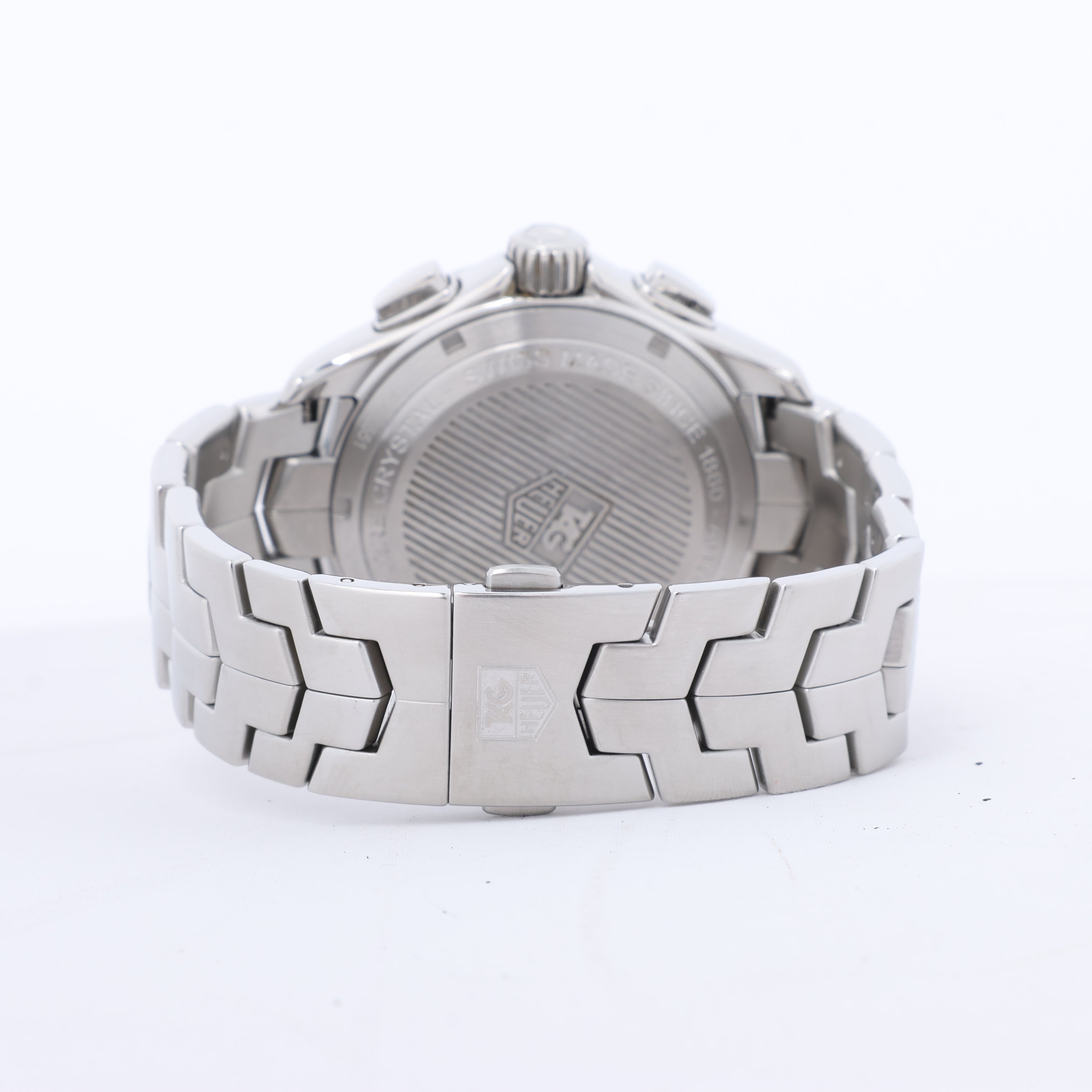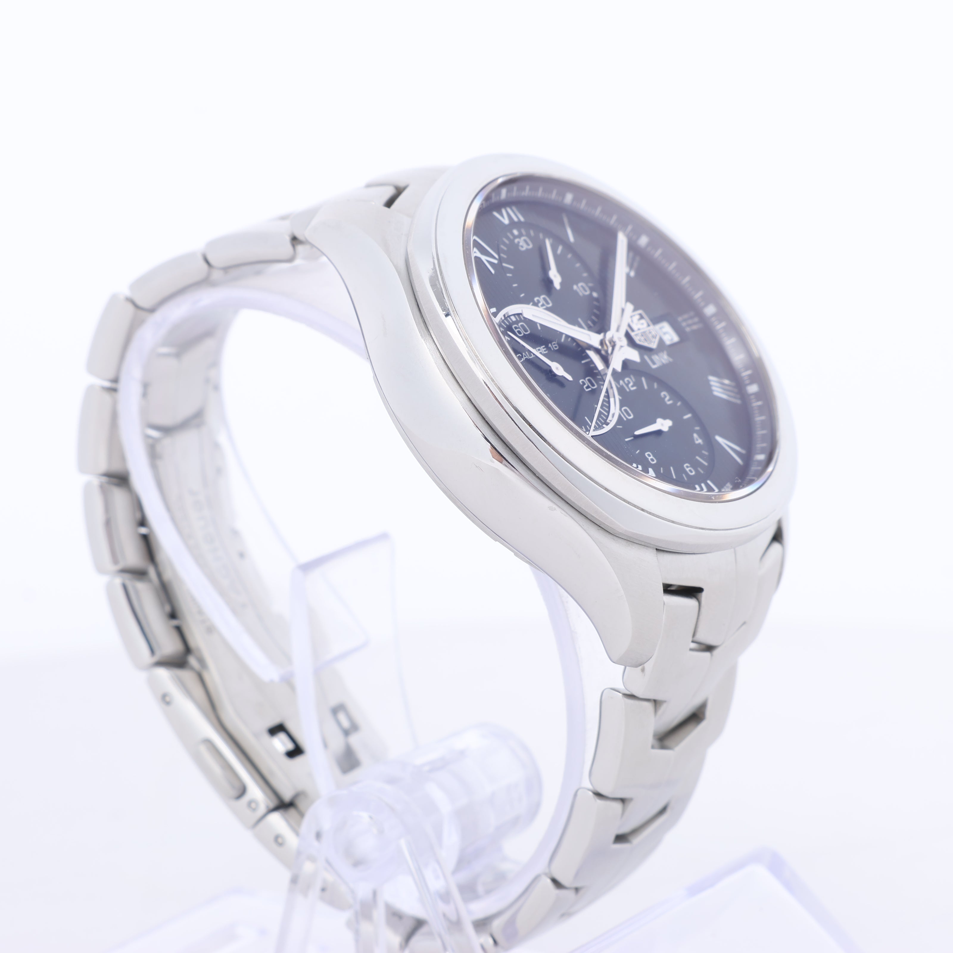 TAG Heuer Link Calibre 16 in stainless steel with a sleek black dial and chronograph detail. Automatic movement, date display, and sporty elegance make this a refined essential for the modern collector.