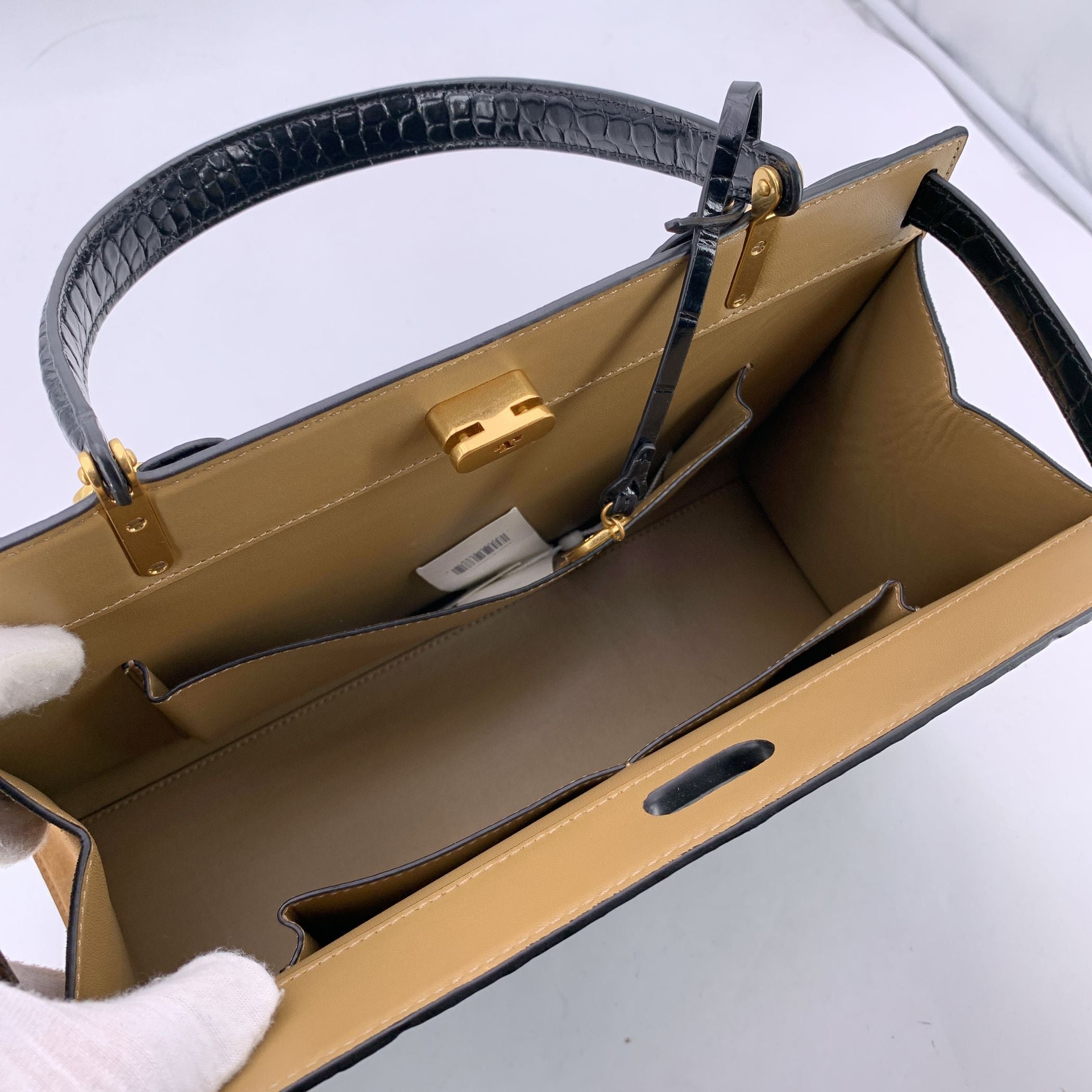 The Tory Burch Lee Radziwill Bag Is a Refined And Elegant Piece, Impeccably Crafted In Luxurious Black Croc-embossed Leather. Inspired By The Timeless Style Of Lee Radziwill-a Woman Celebrated For Her Individuality And Grace-the Bag Exudes Sophistication With Its Structured Frame Silhouette. It Is Detailed With Tory Burch's Signature Lock-and-key Hardware And Includes An Optional Shoulder Strap For Versatile Carrying. The Interior Is Lined With Smooth Leather And Features a Single Side Zip Pocket For Essentials. Both Classic And Contemporary, This Bag Is a Tribute To Bold, Effortless Style.
