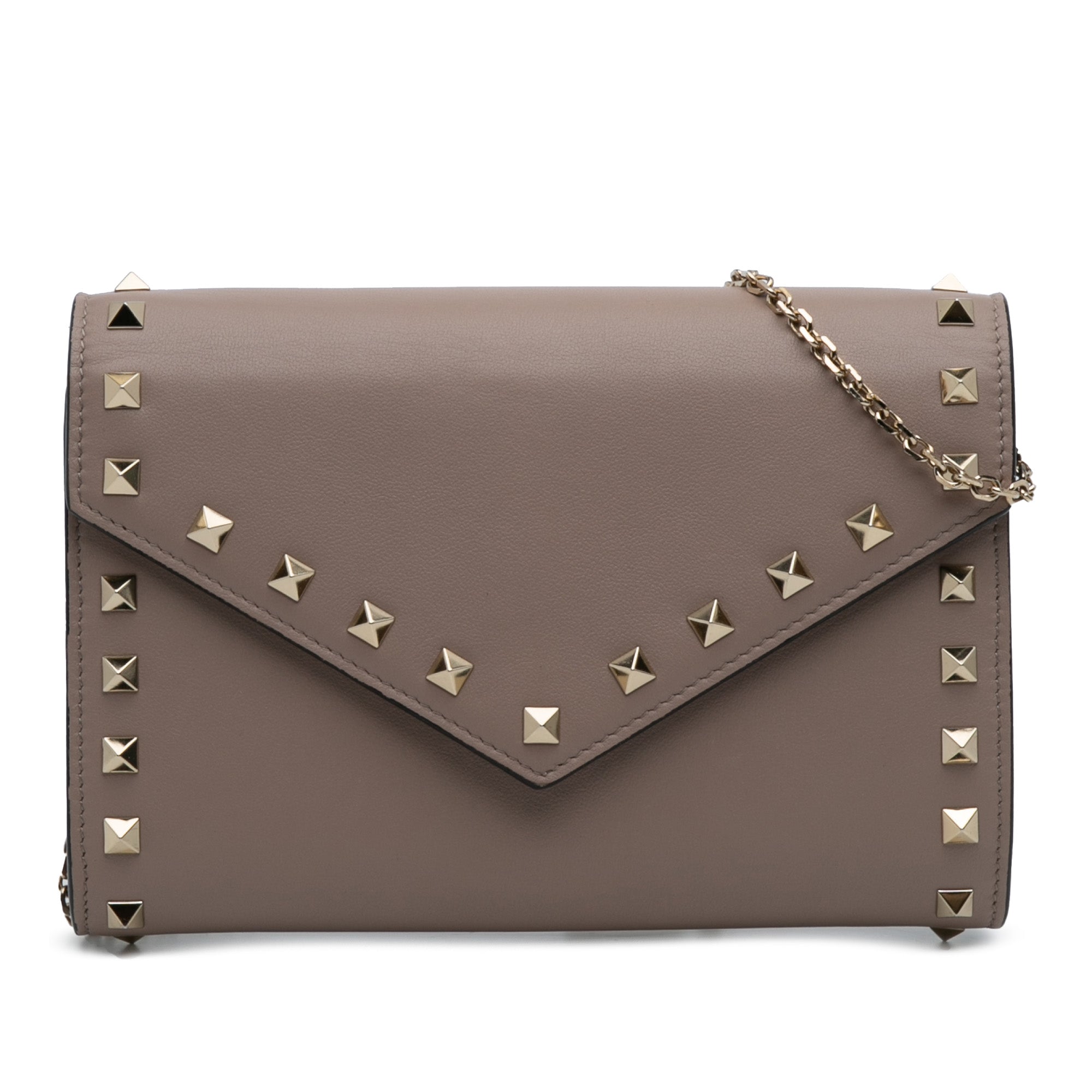 The Rockstud Envelope Wallet on Chain features a studded leather body, a gold-tone curb chain link shoulder strap, a front flap with magnetic snap closure, interior zip and slip compartment and card slots. Inclusion: Dust bag. Retail Price: 800.00