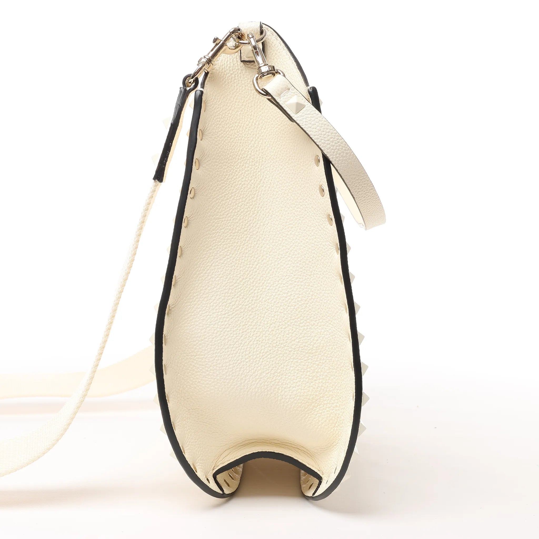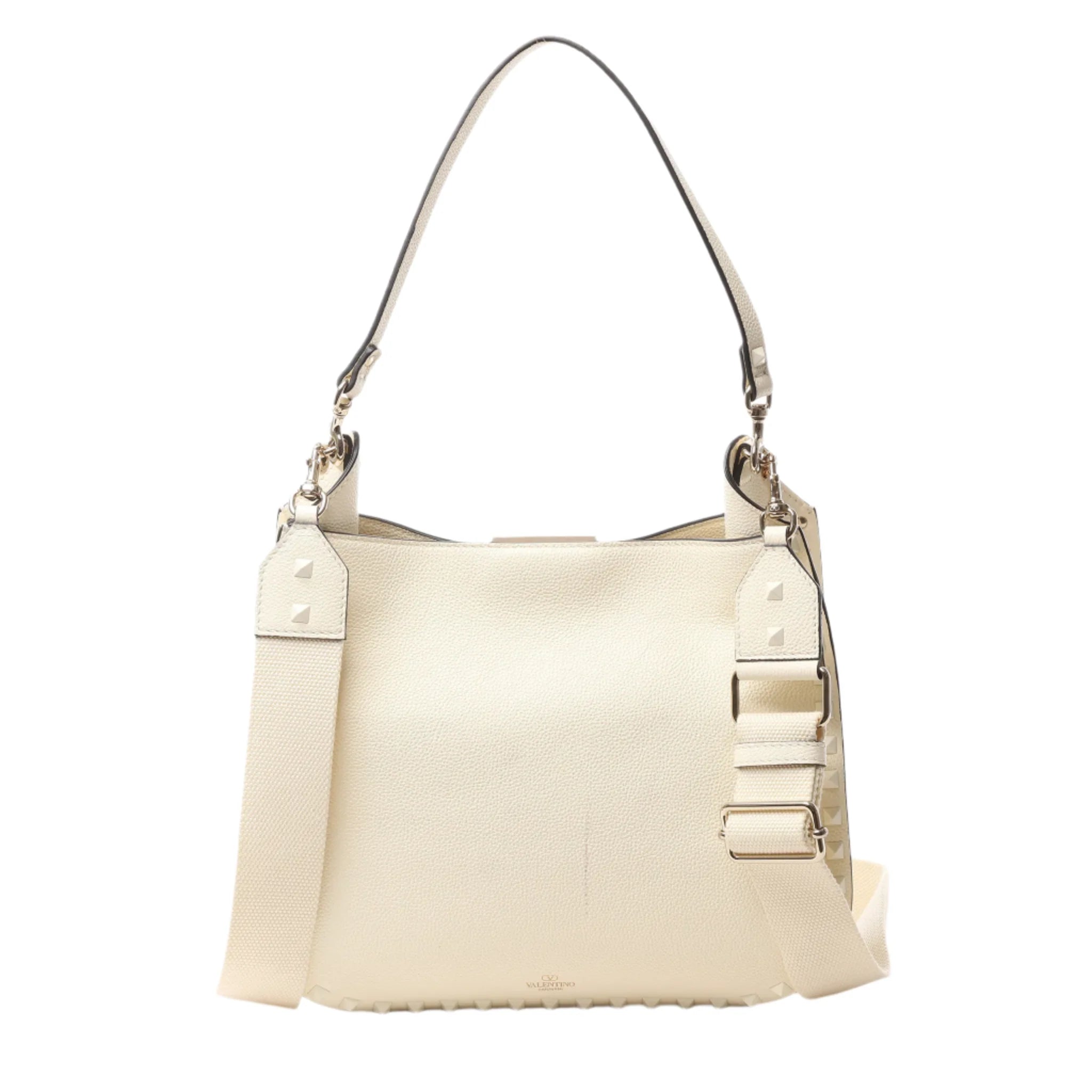 Valentino Garavani Rockstud Shoulder Bag in ecru grained leather, featuring iconic pyramid stud detailing, a wide adjustable strap, and sleek silhouette. A perfect blend of elegance and edge for elevated everyday wear.