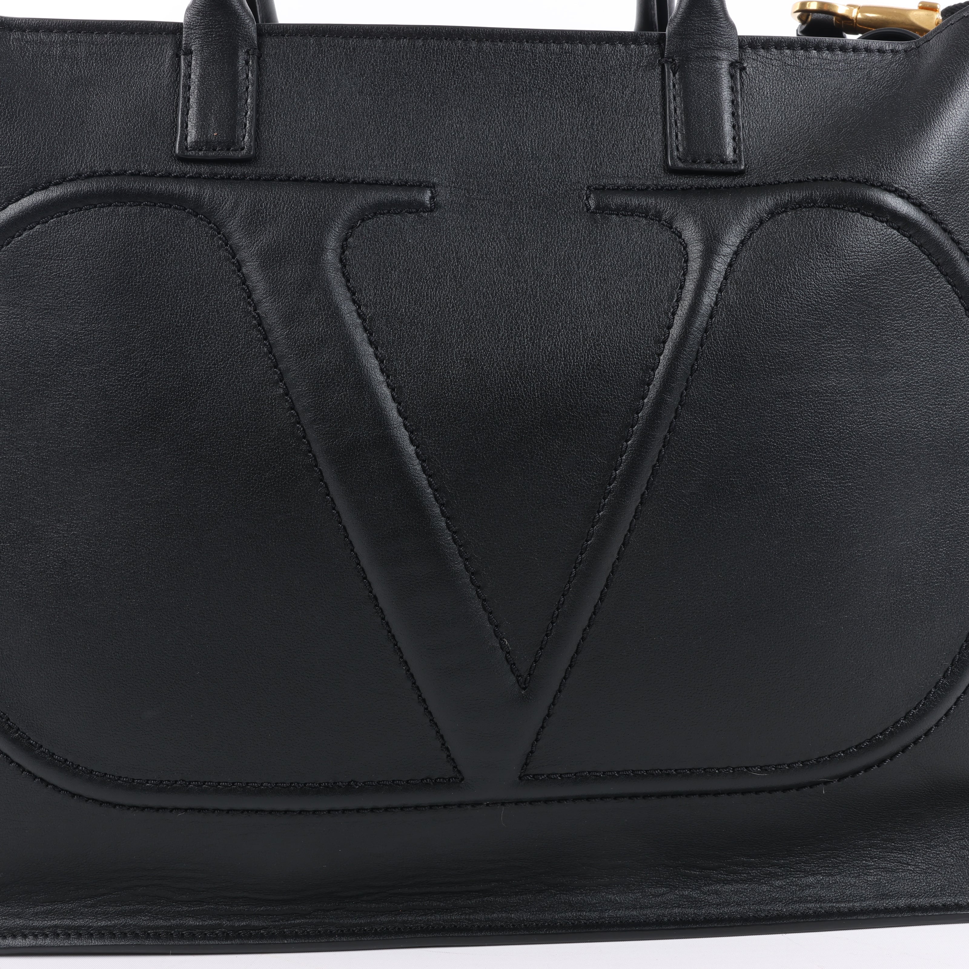 Valentino Garavani V Logo 2-way handbag in sleek black leather, featuring an embossed oversized V, top handles, and a detachable strap. A refined, modern silhouette perfect for elevated everyday style.