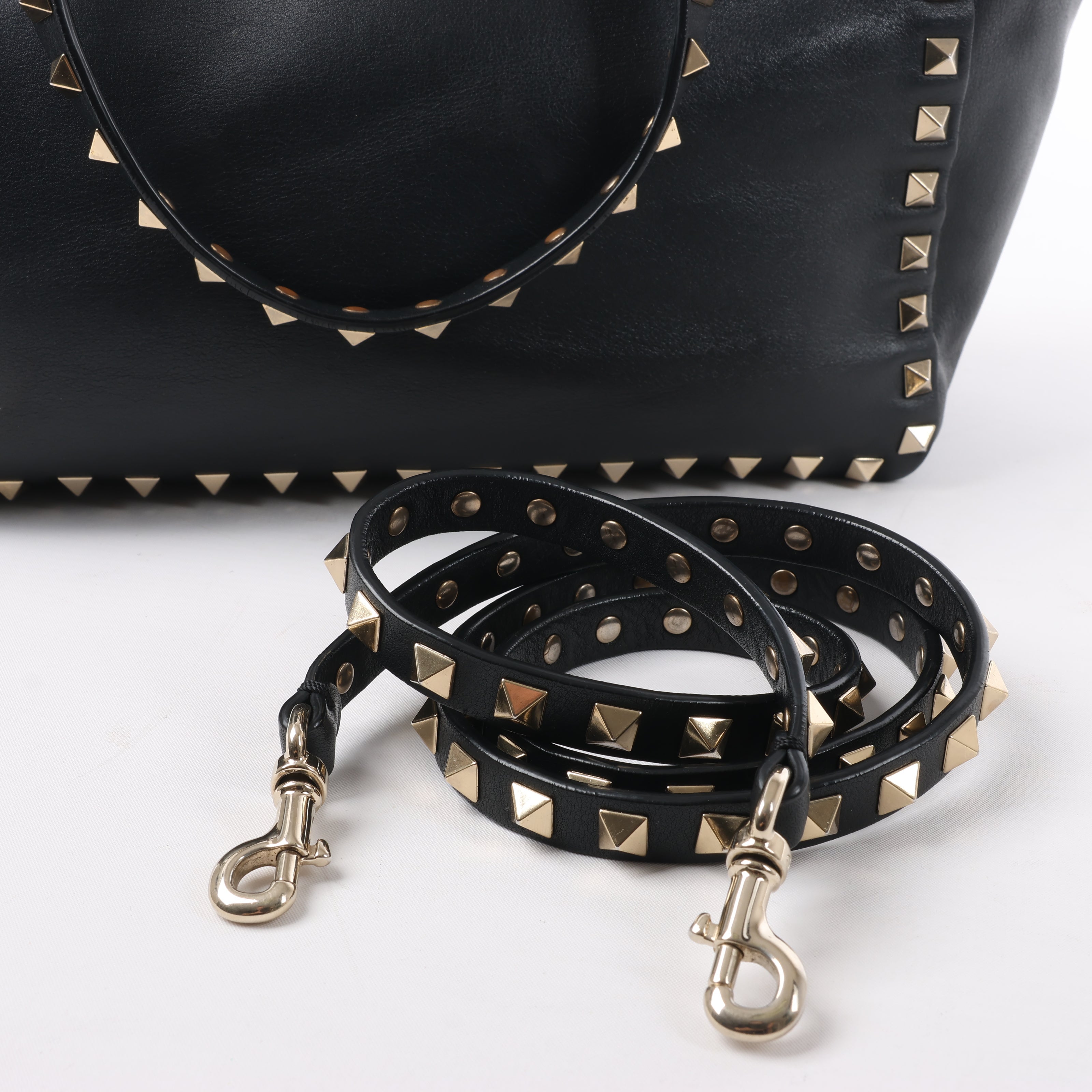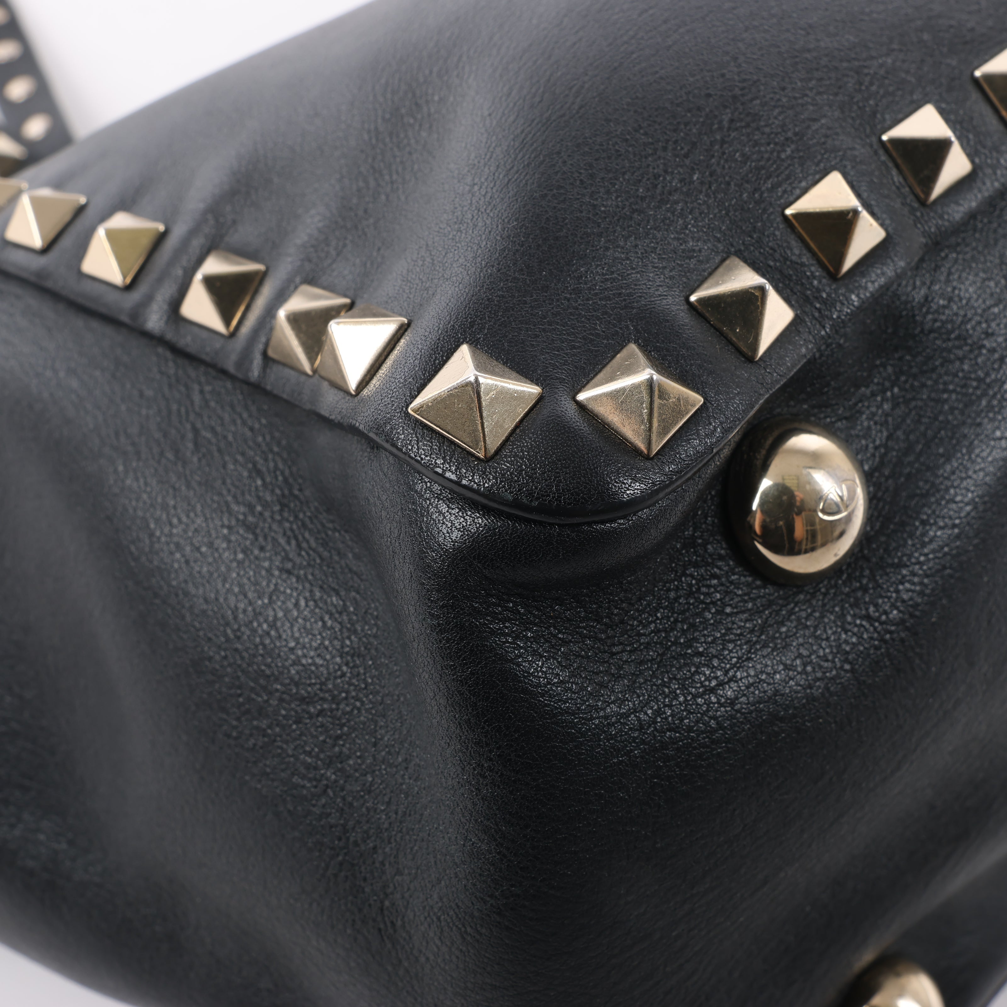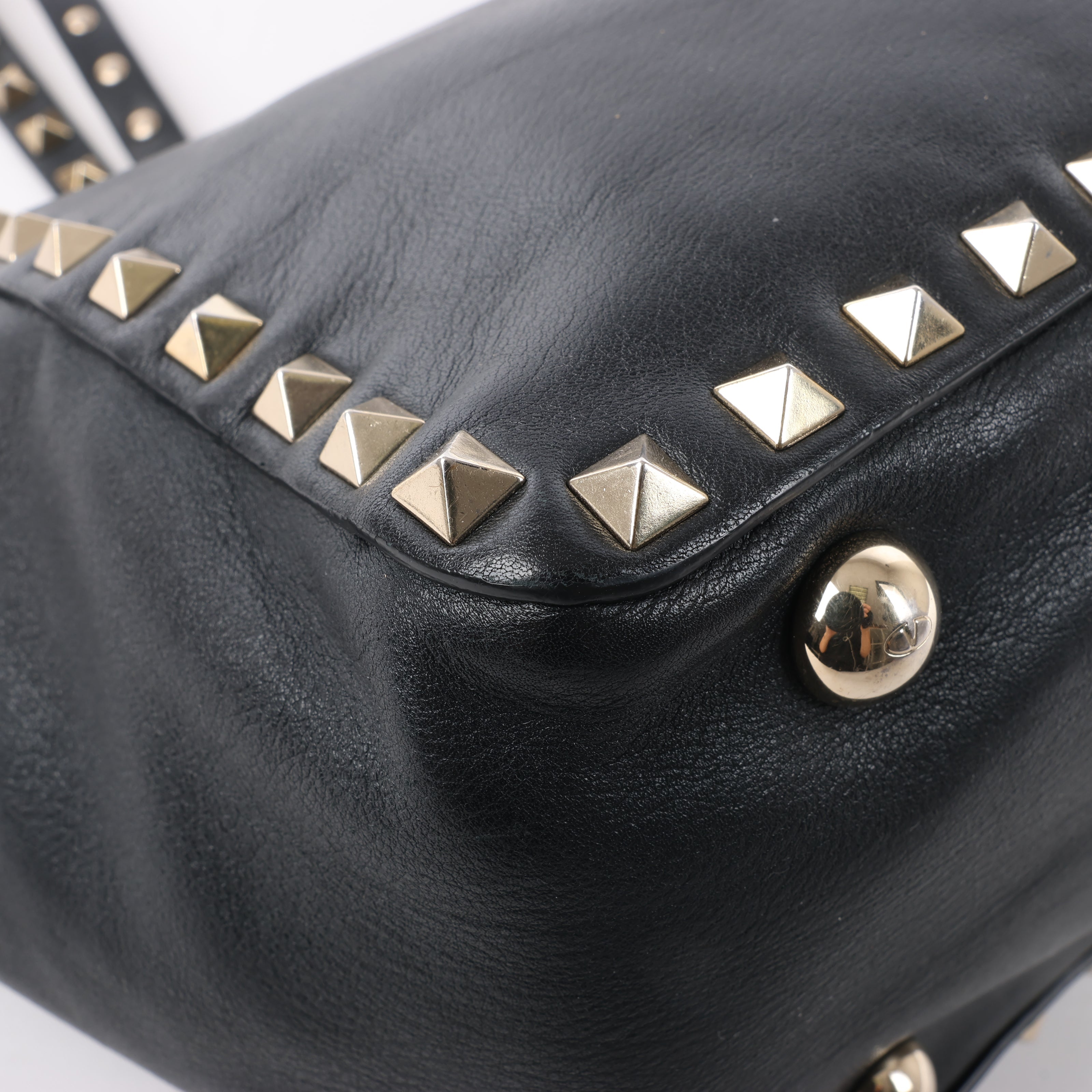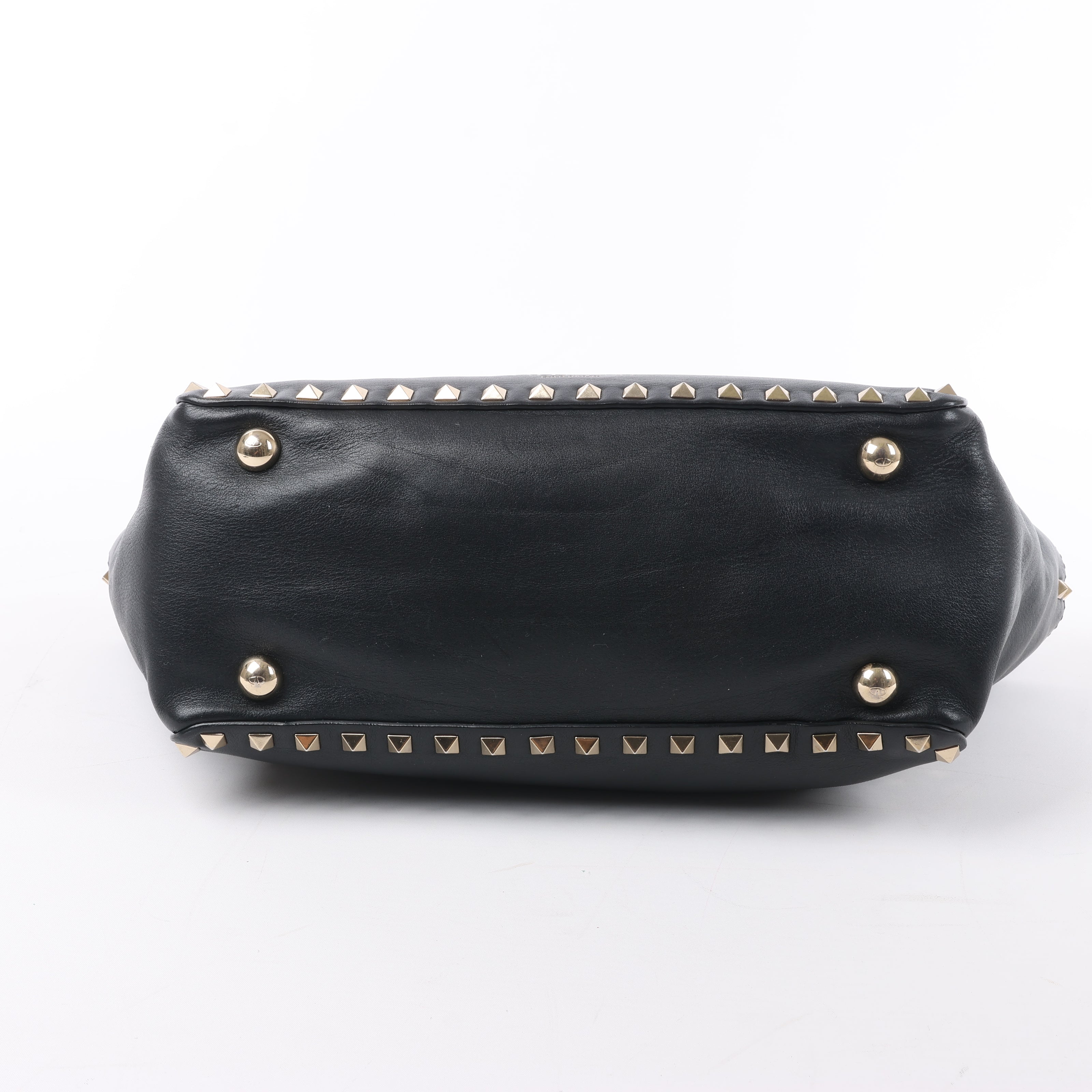 Brand: Valentino GaravaniModel: RockstudSize: -Width: 25 cmHeight: 20.5 cm Exterior Condition: ExcellentInterior Condition: ExcellentCondition Details: The exterior leather remains clean and beautiful with creases and scratches. The handle and shoulder strap is in great condition. The hardware is bright and shiny with scratches. Note: One stud is missing. The interior lining is in good condition. Top width is 41 cm.Colour: BlackInterior Colour: BlackHardware Colour: GoldMaterial: LeatherComes With: Shoulder strap