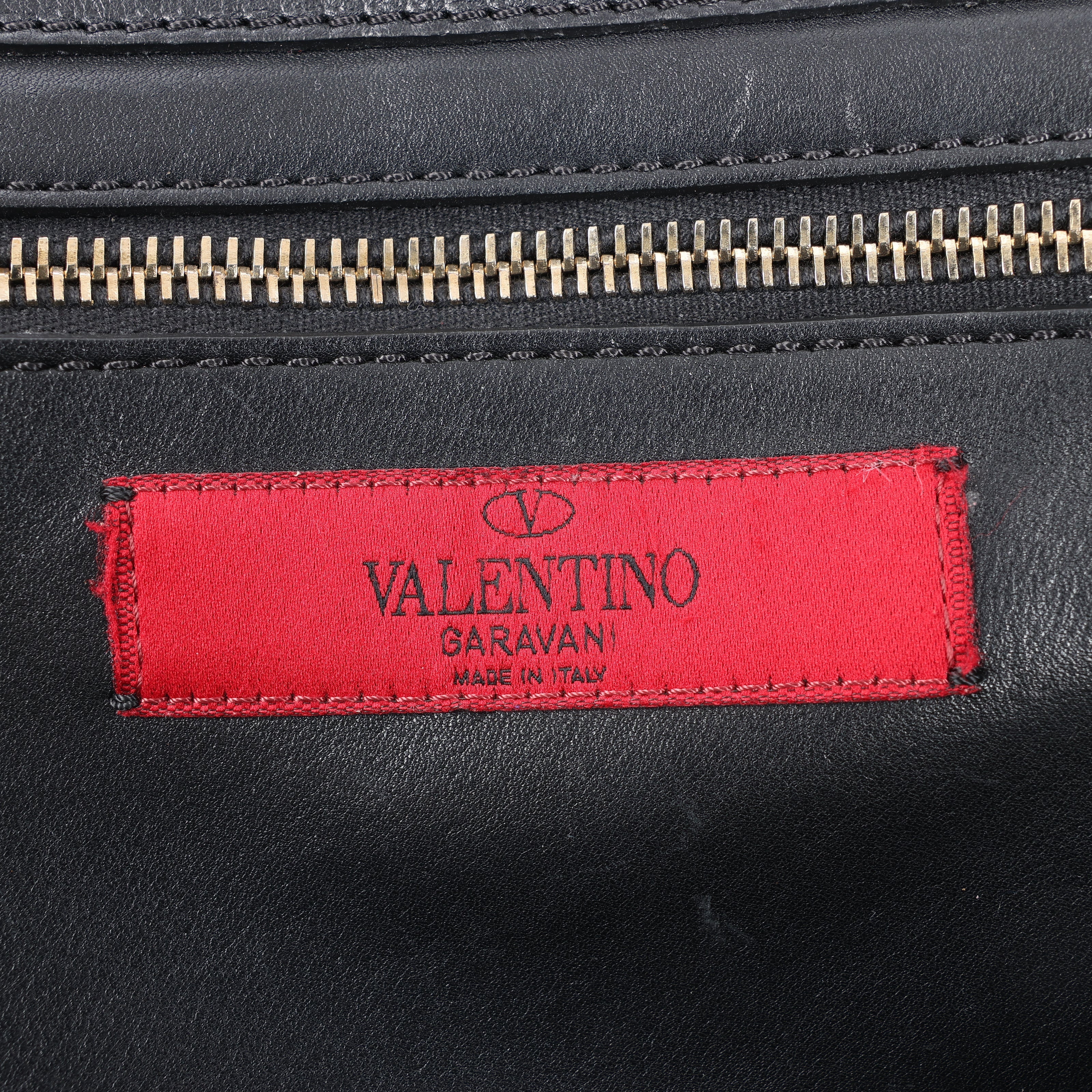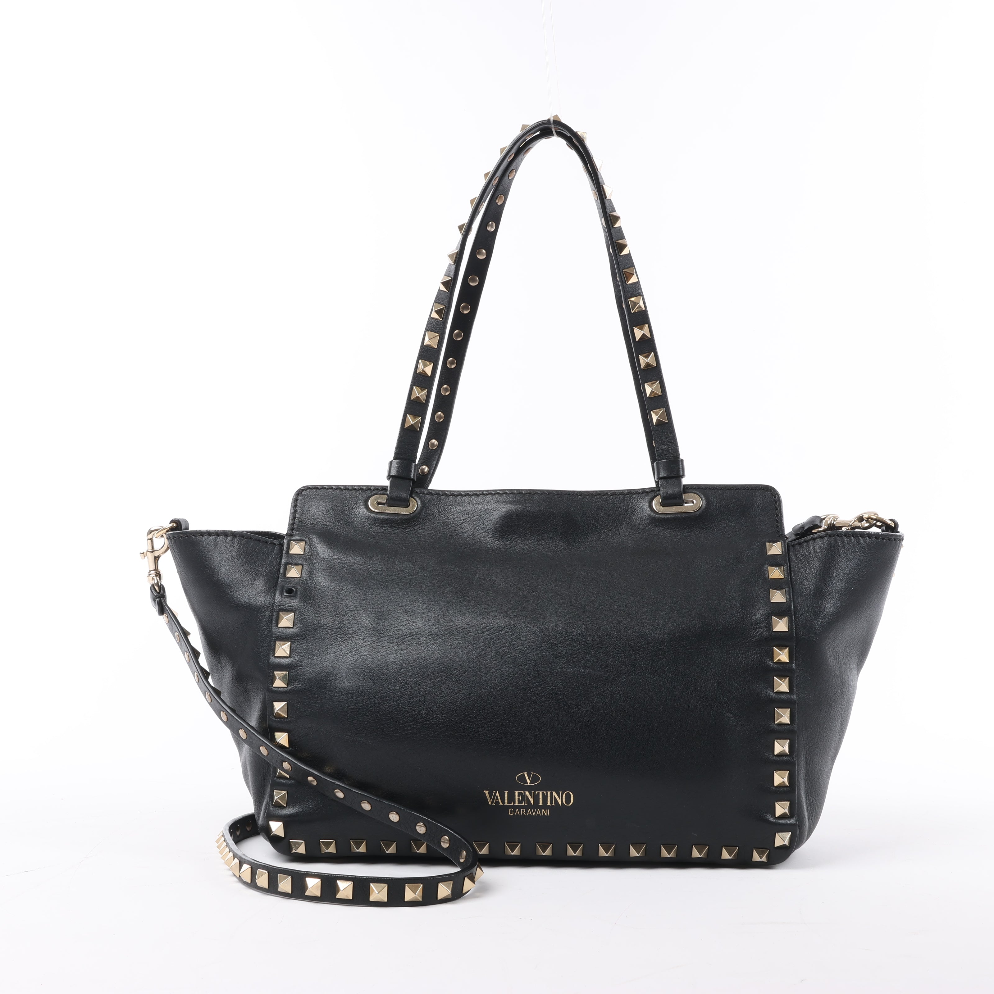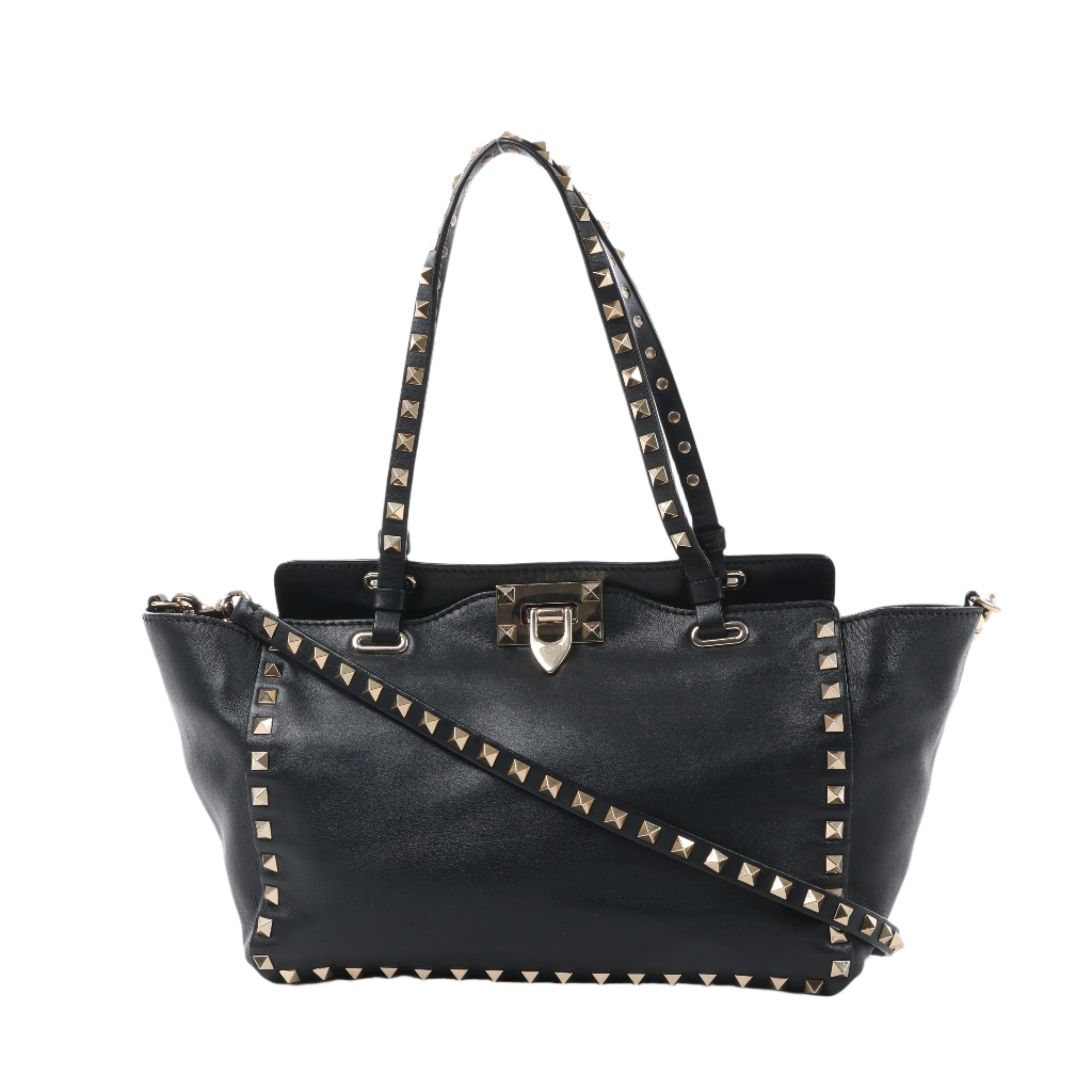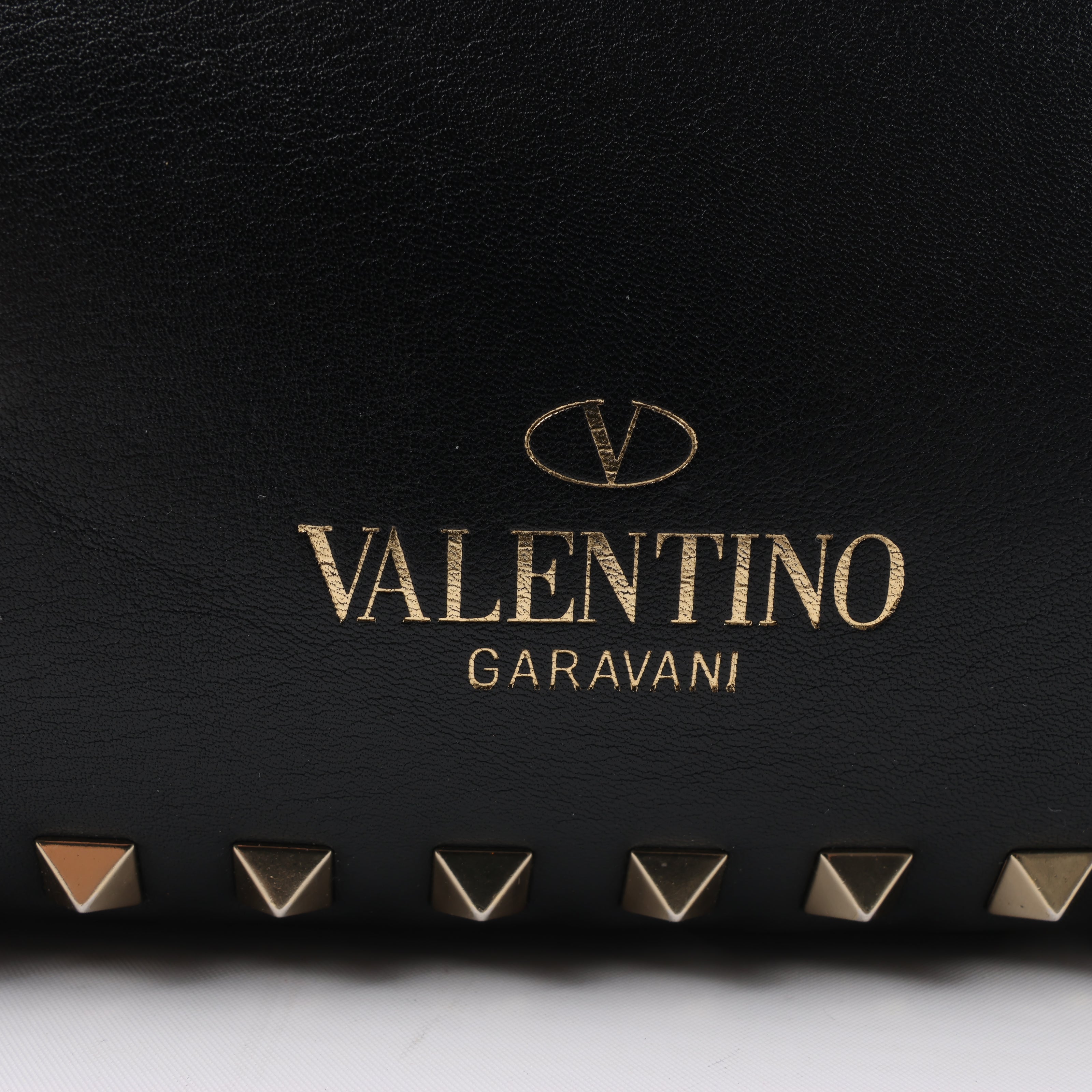 Brand: Valentino GaravaniModel: RockstudSize: -Width: 25 cmHeight: 20.5 cm Exterior Condition: ExcellentInterior Condition: ExcellentCondition Details: The exterior leather remains clean and beautiful with creases and scratches. The handle and shoulder strap is in great condition. The hardware is bright and shiny with scratches. Note: One stud is missing. The interior lining is in good condition. Top width is 41 cm.Colour: BlackInterior Colour: BlackHardware Colour: GoldMaterial: LeatherComes With: Shoulder strap
