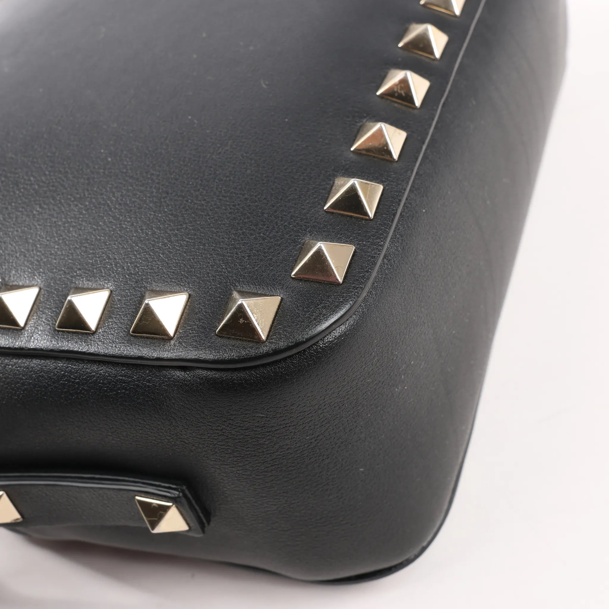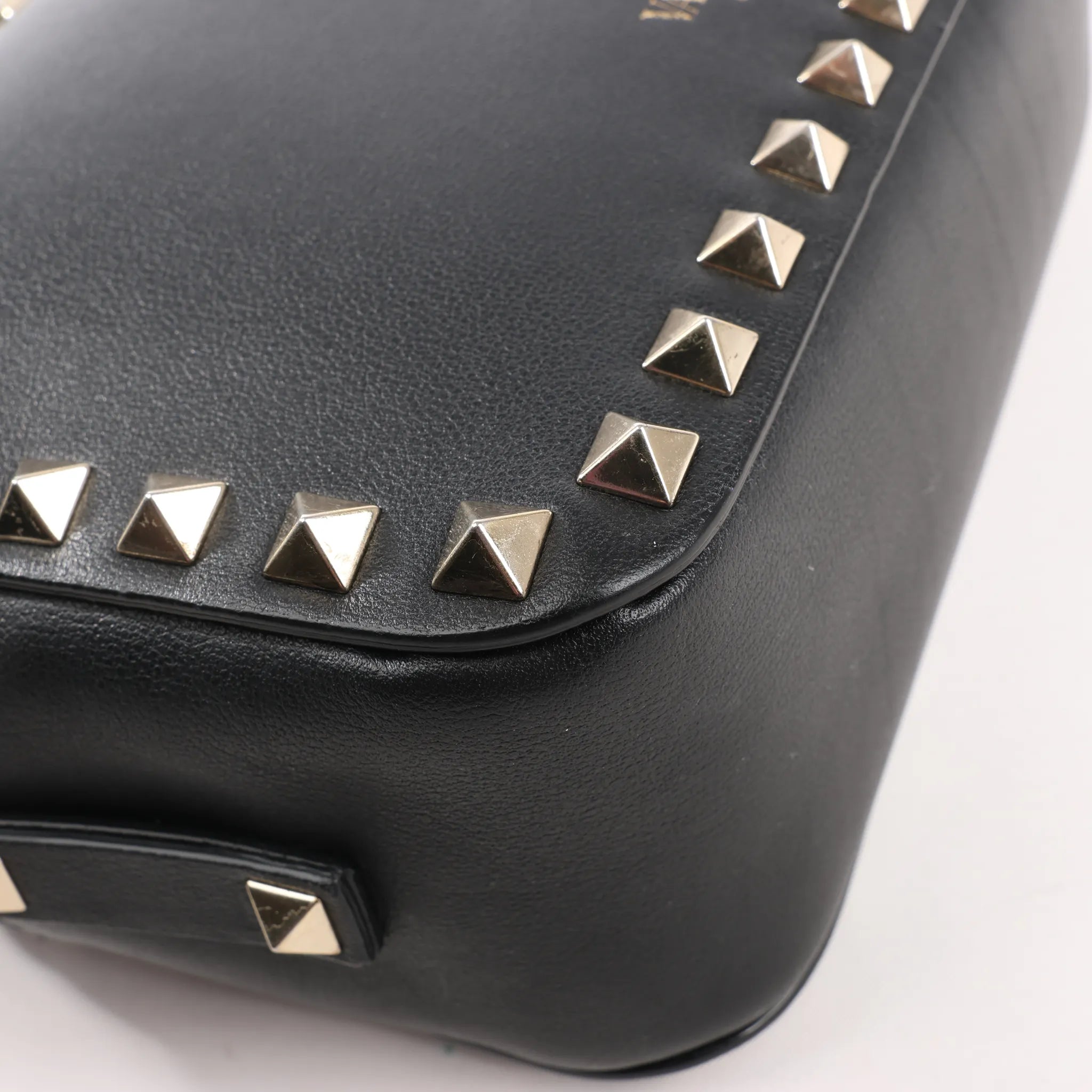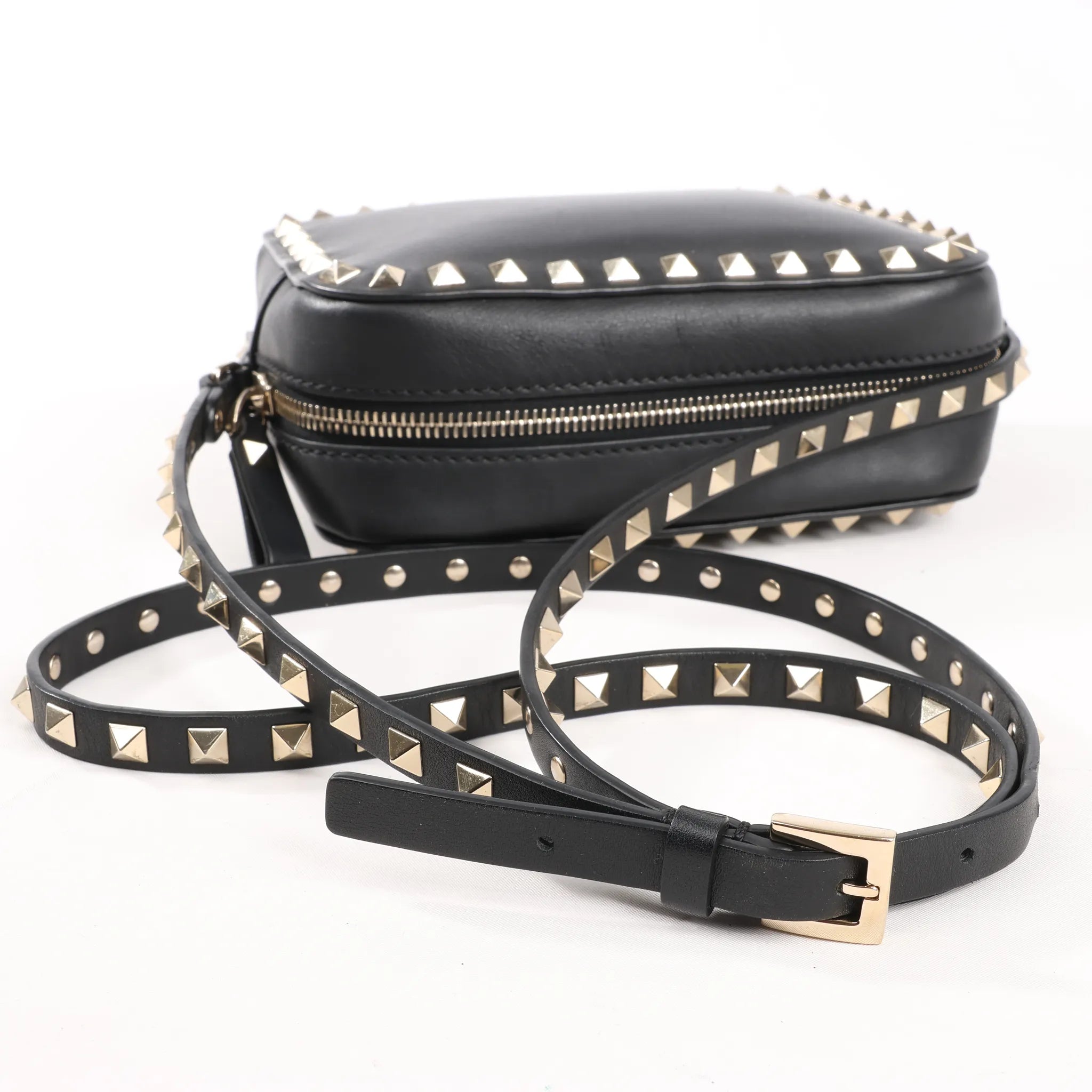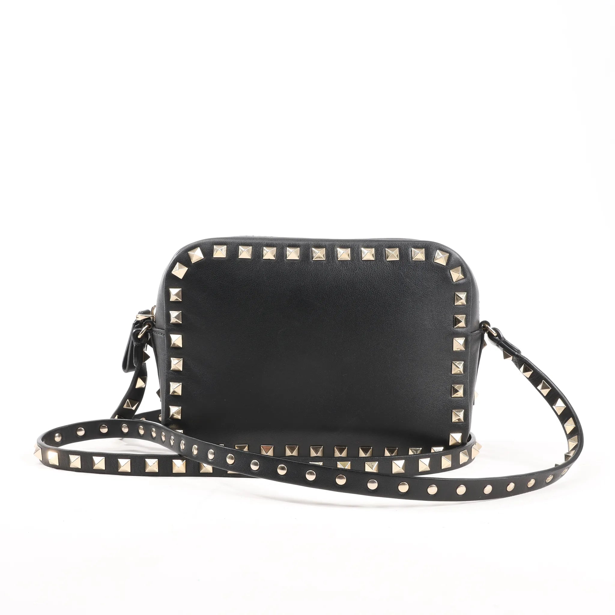 Brand: Valentino GaravaniModel: Rockstud Size: -Width: 18.5 cmHeight: 14 cm Exterior Condition: ExcellentInterior Condition: ExcellentCondition Details: The exterior leather remains clean and beautiful with small scratches. The shoulder strap is in great condition. The hardware is bright and shiny with hairline surface scratches. The interior lining is clean and overall in great condition, except some dust.Colour: BlackInterior Colour: BlackHardware Colour: GoldMaterial: LeatherComes With: -