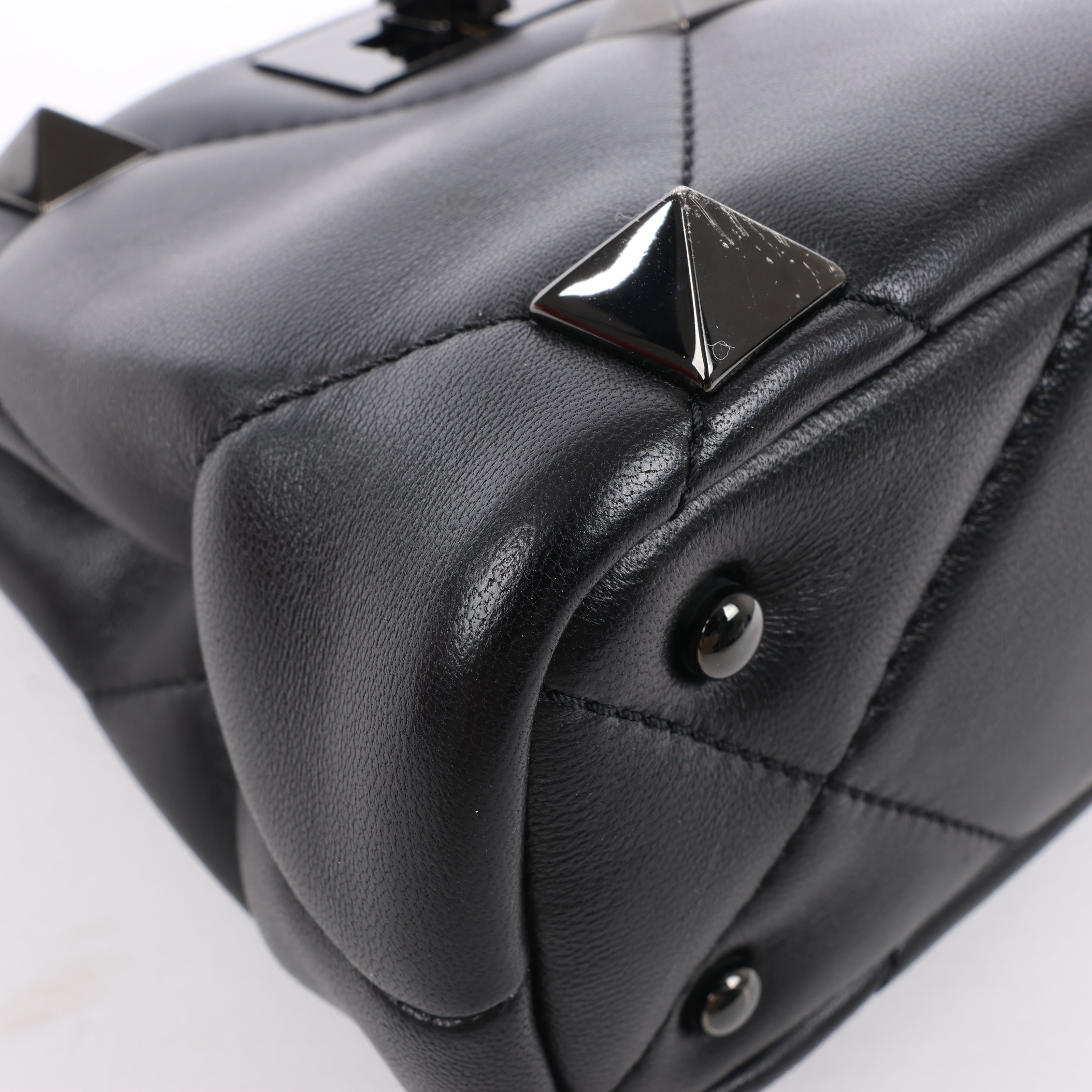 Valentino Garavani Roman Studs bag in black leather features bold pyramid studs, sleek gunmetal hardware, and a versatile 3-way design—carry it by top handle, chain strap, or shoulder strap for edgy elegance on any occasion.