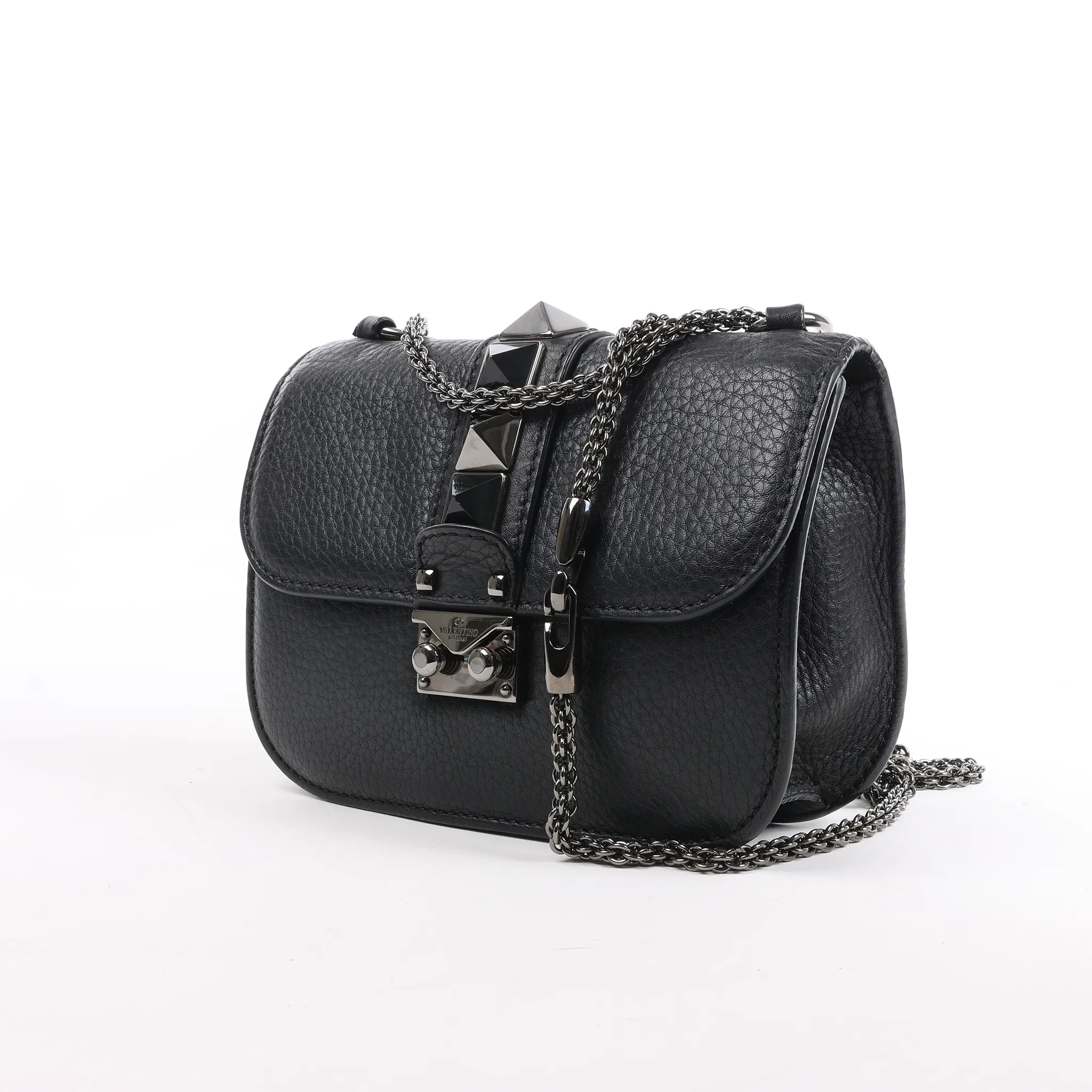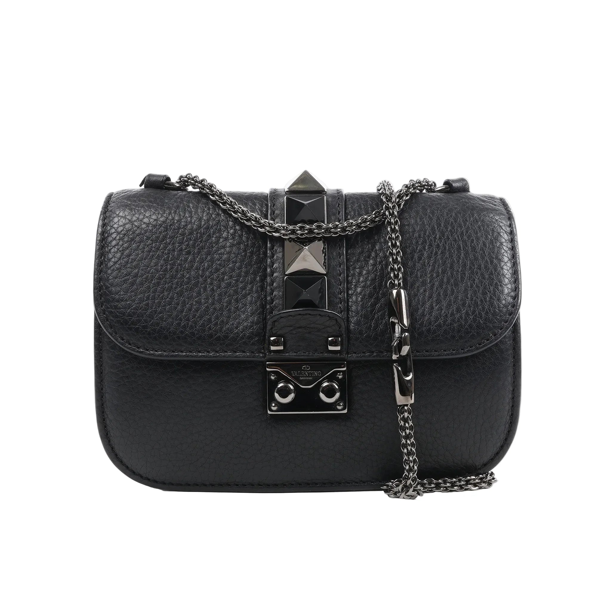 The Valentino Rockstud Glam Lock Chain Shoulder Bag in black leather brings edgy elegance with its signature pyramid studs and sleek metal chain. A bold statement piece, perfect for evening style and modern sophistication.