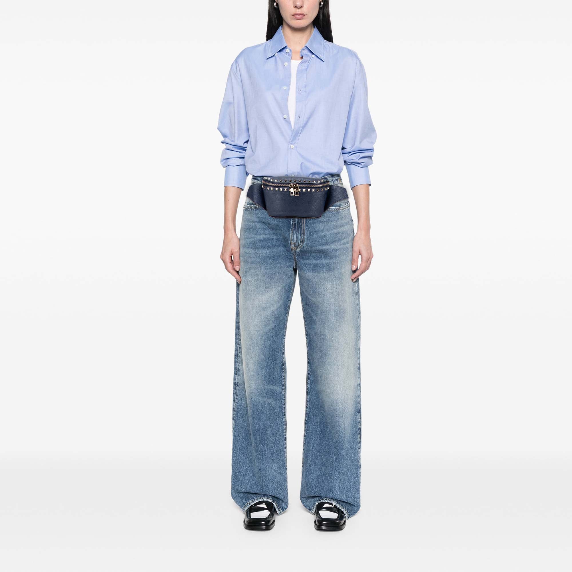 This belt bag features a studded leather body, an adjustable flat leather waist strap, a top zip closure, an exterior back zip pocket, and an interior slip pocket. Retail Price: 1295.00