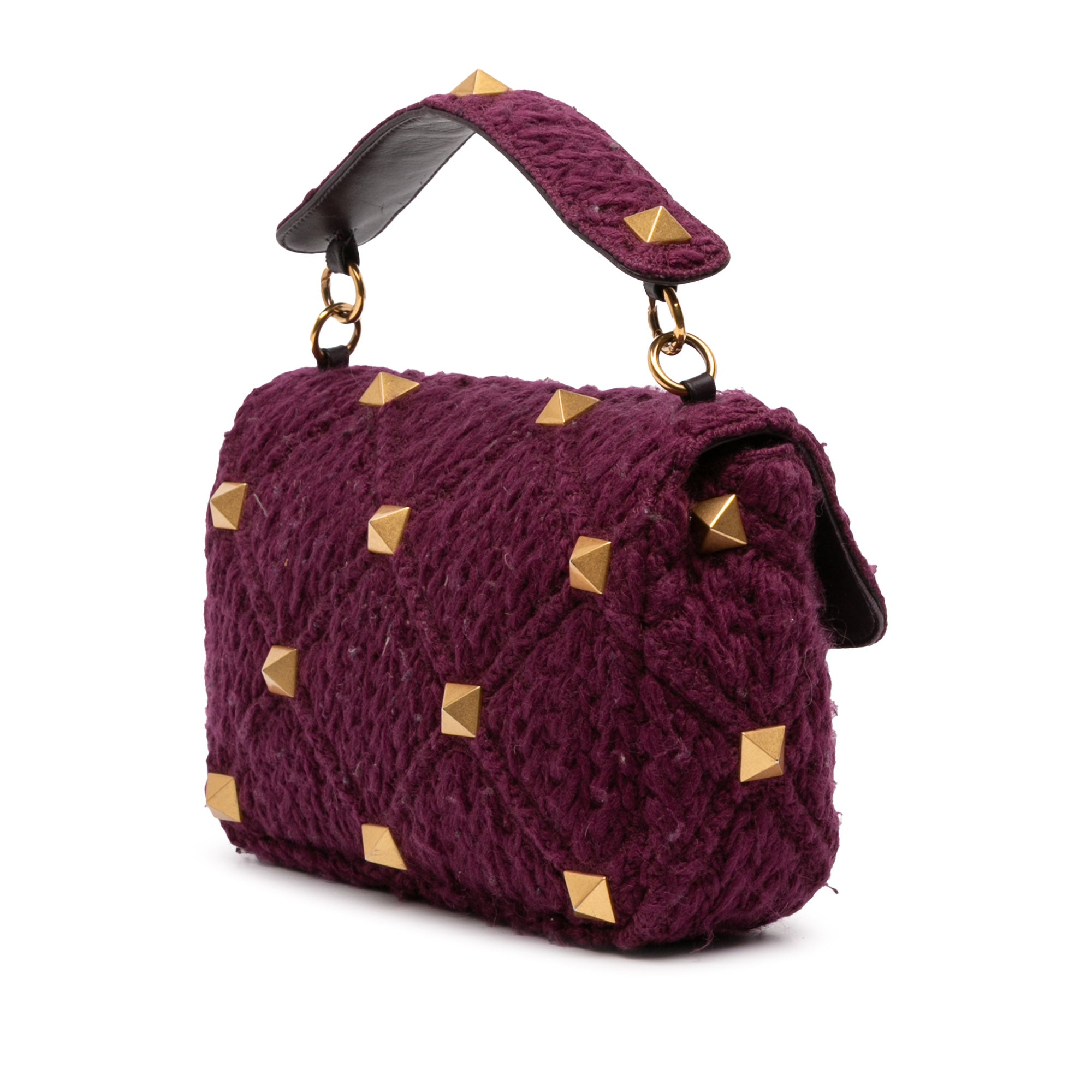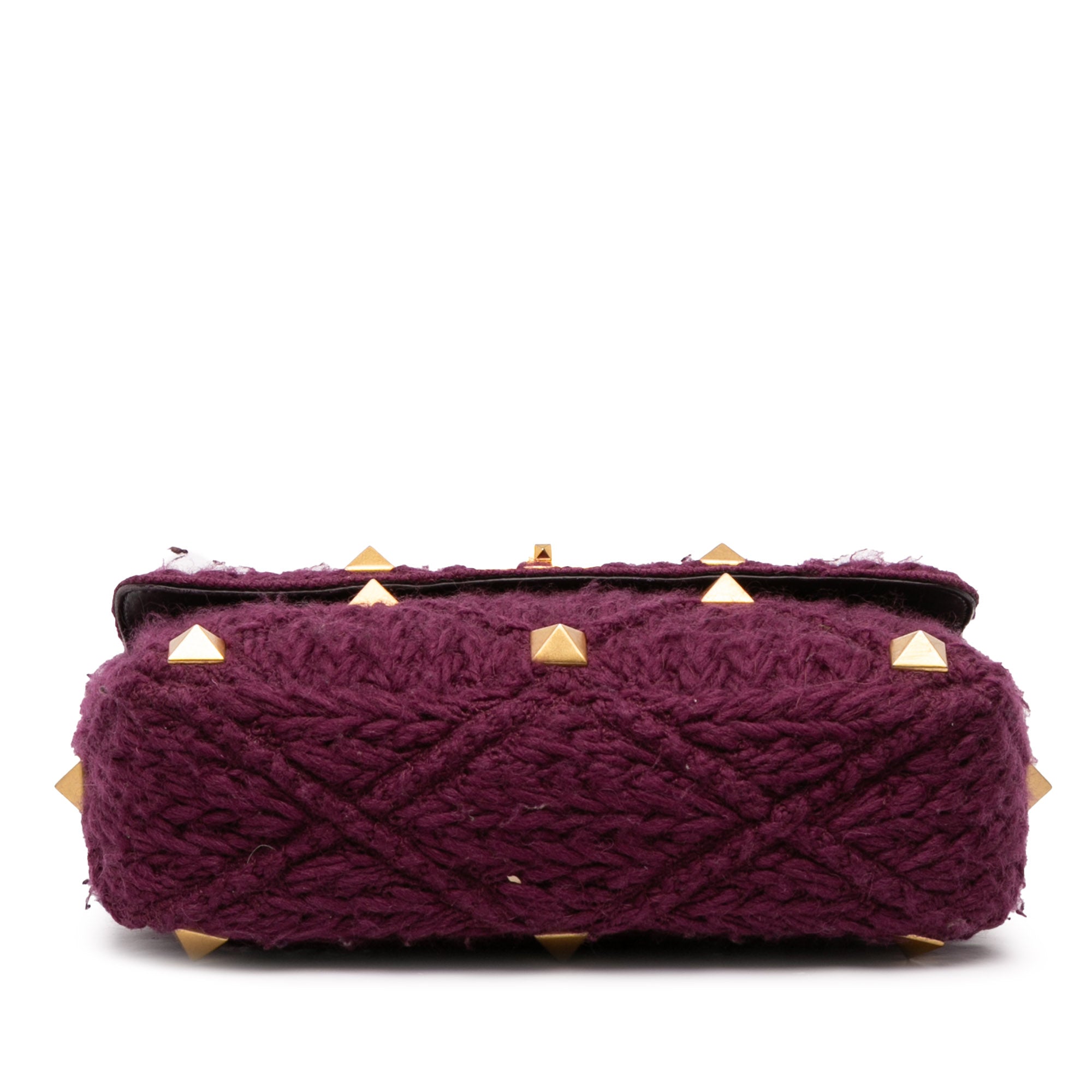 This satchel features a knitted and studded body, a flat top handle, a detachable gold-tone chain shoulder strap, a flap with twist lock closure, and interior zip and slip pockets. Inclusion: Dust bag. Retail Price: 1850.00