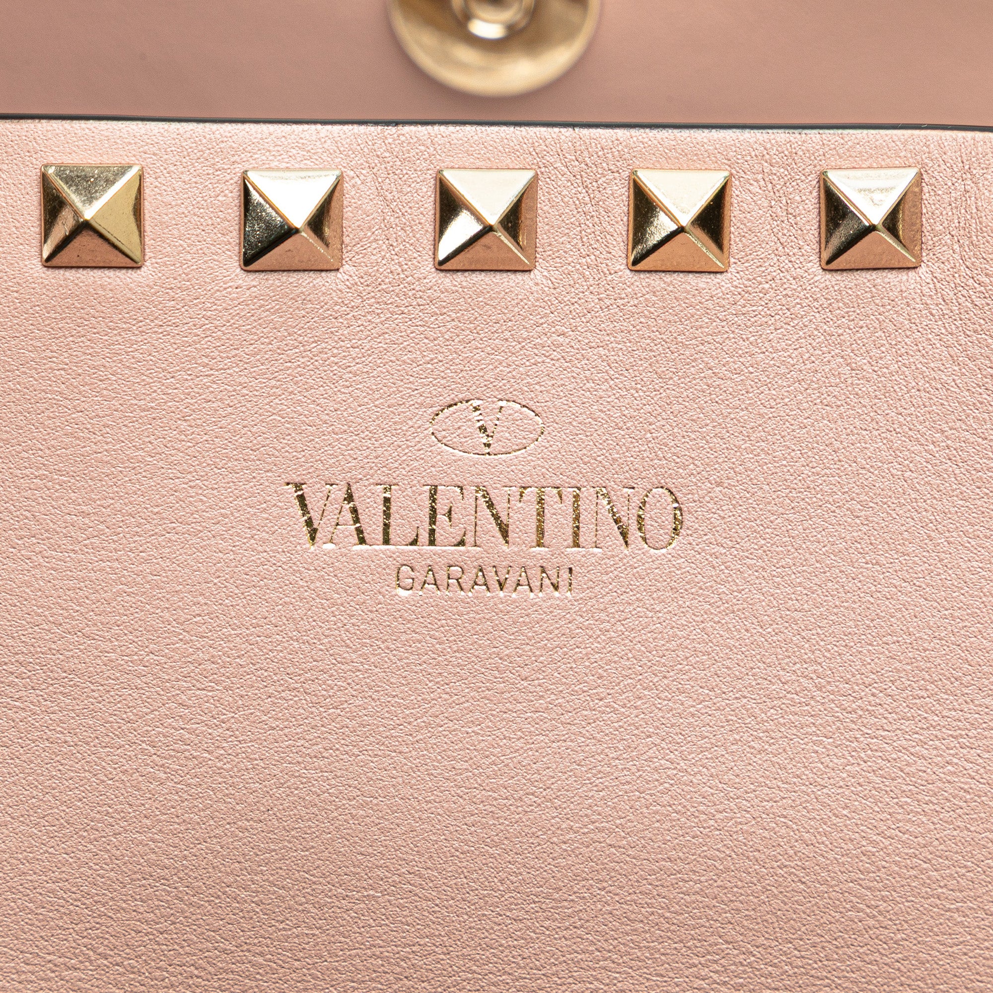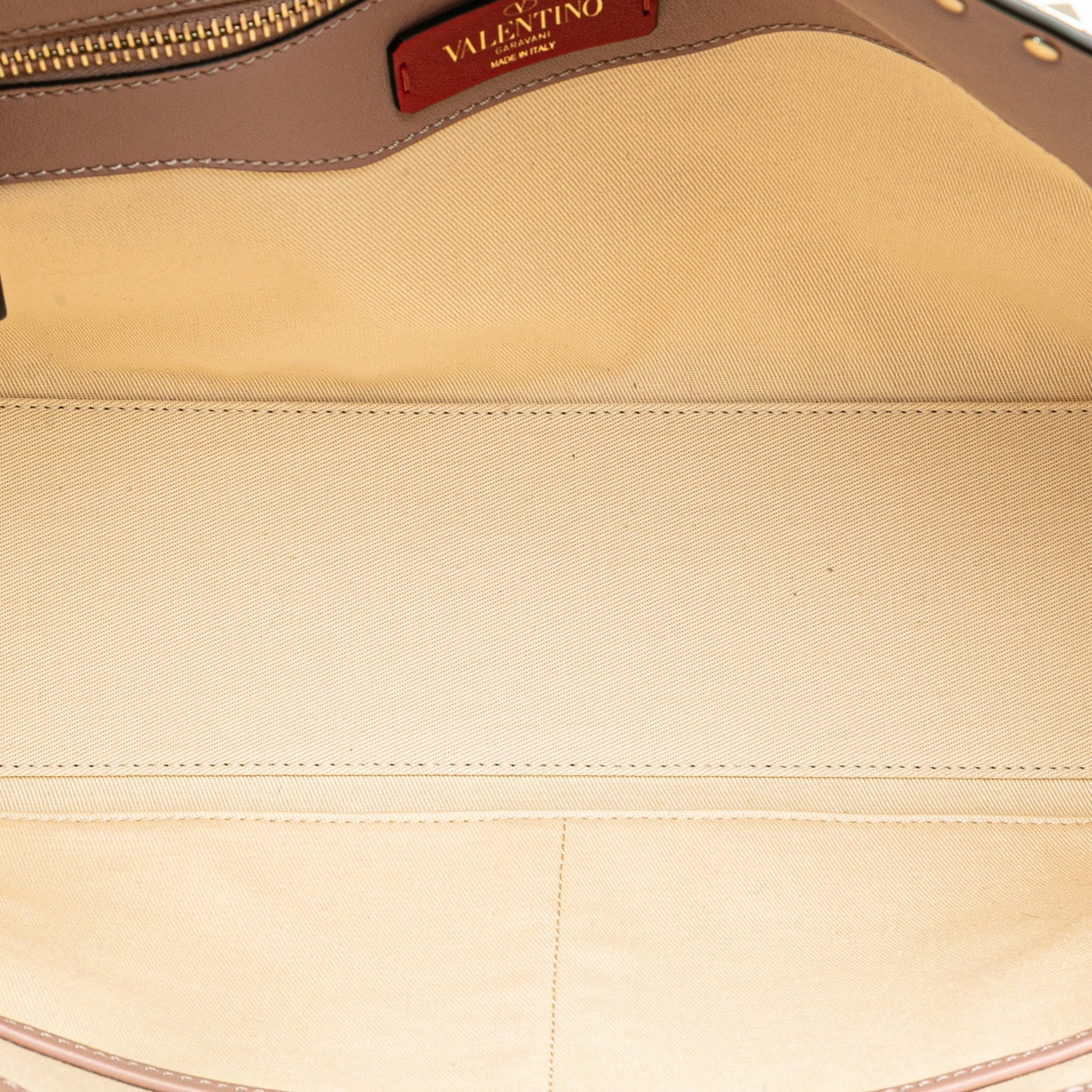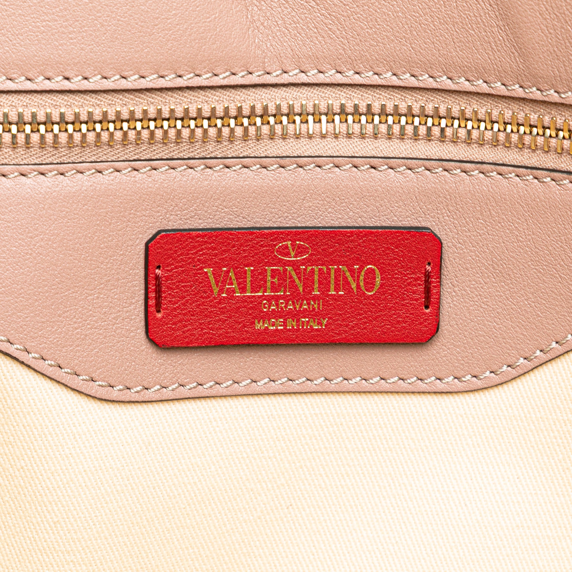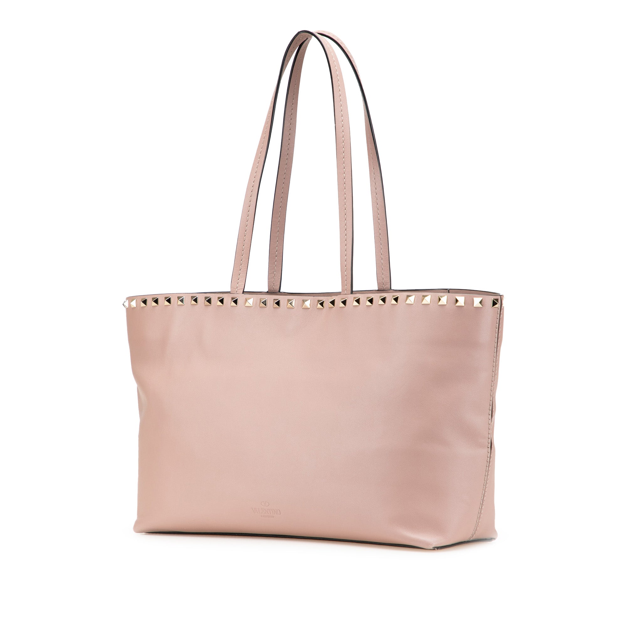 This tote bag features a leather body with rockstud embellishments, flat leather straps, an open top with magnetic snap closure, and interior zip and slip pockets. Retail Price: 1850.00