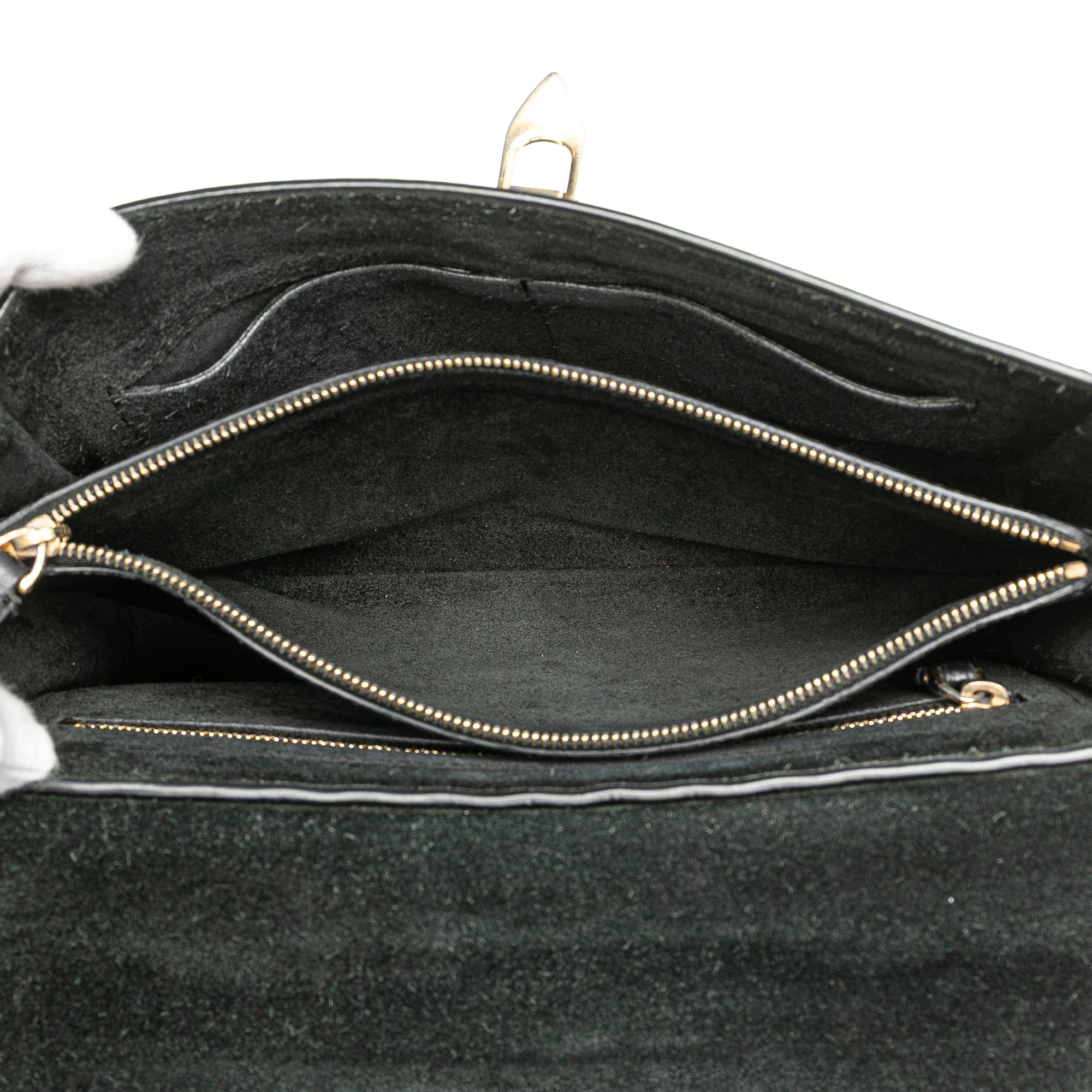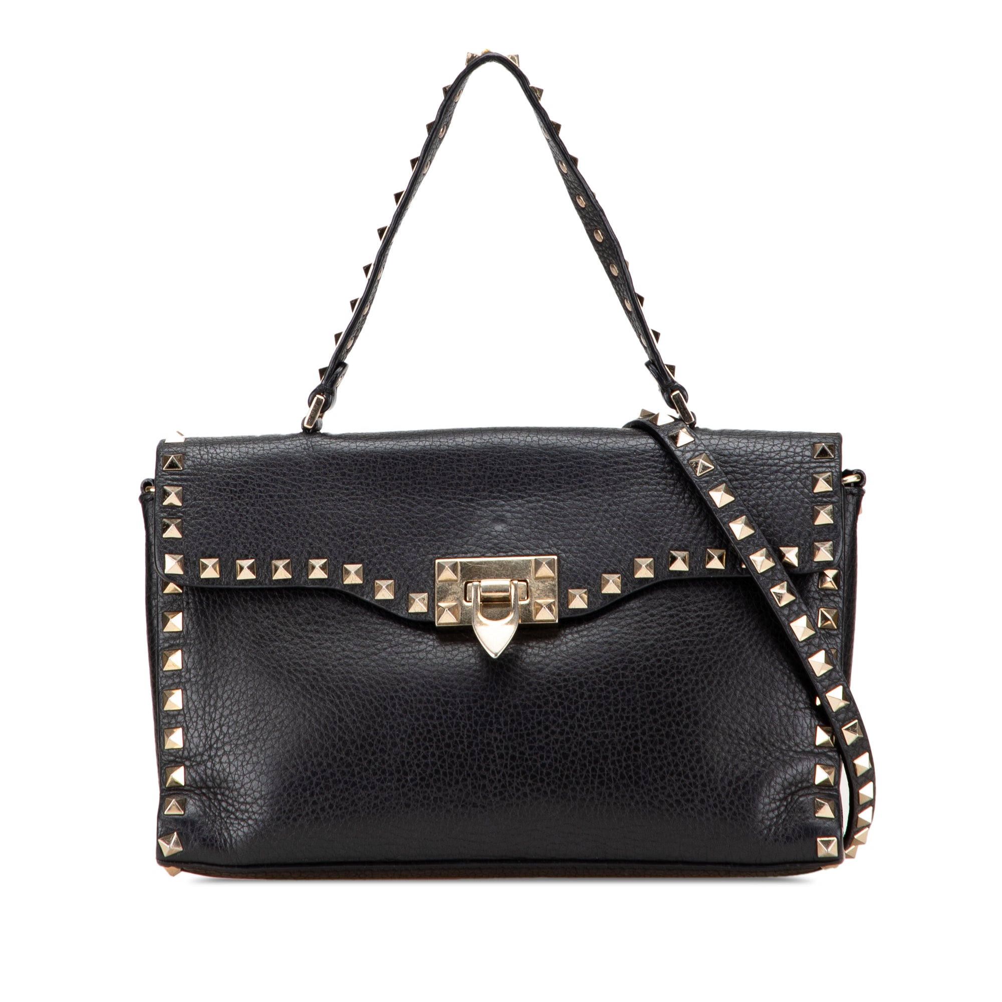 This satchel features a leather body with stud details, a flat top handle with stud details, a detachable strap, a front flap with a flip lock closure, and interior zip and slip pockets. Retail Price: 1730.00