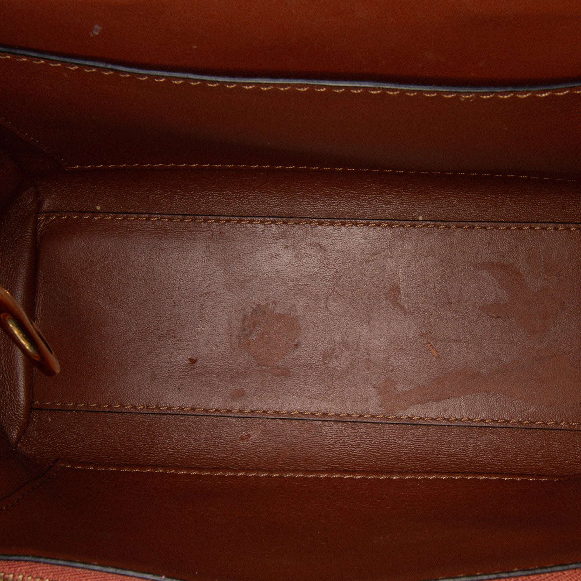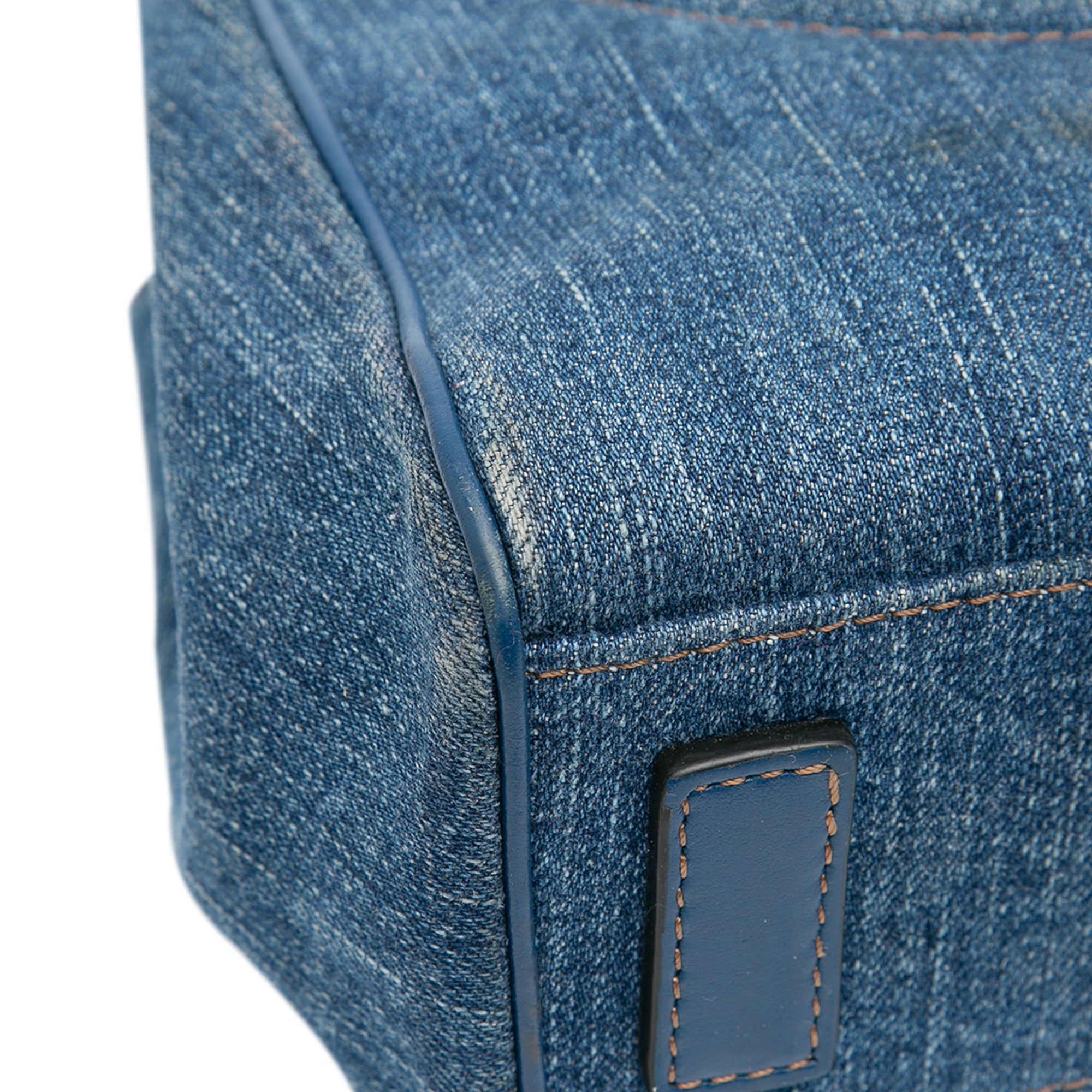This satchel features a denim body with gold-tone hardware, rolled leather handles, a detachable flat canvas shoulder strap, an open top with claw clasp closure, and interior zip and slip pockets. Retail Price: 2150.00